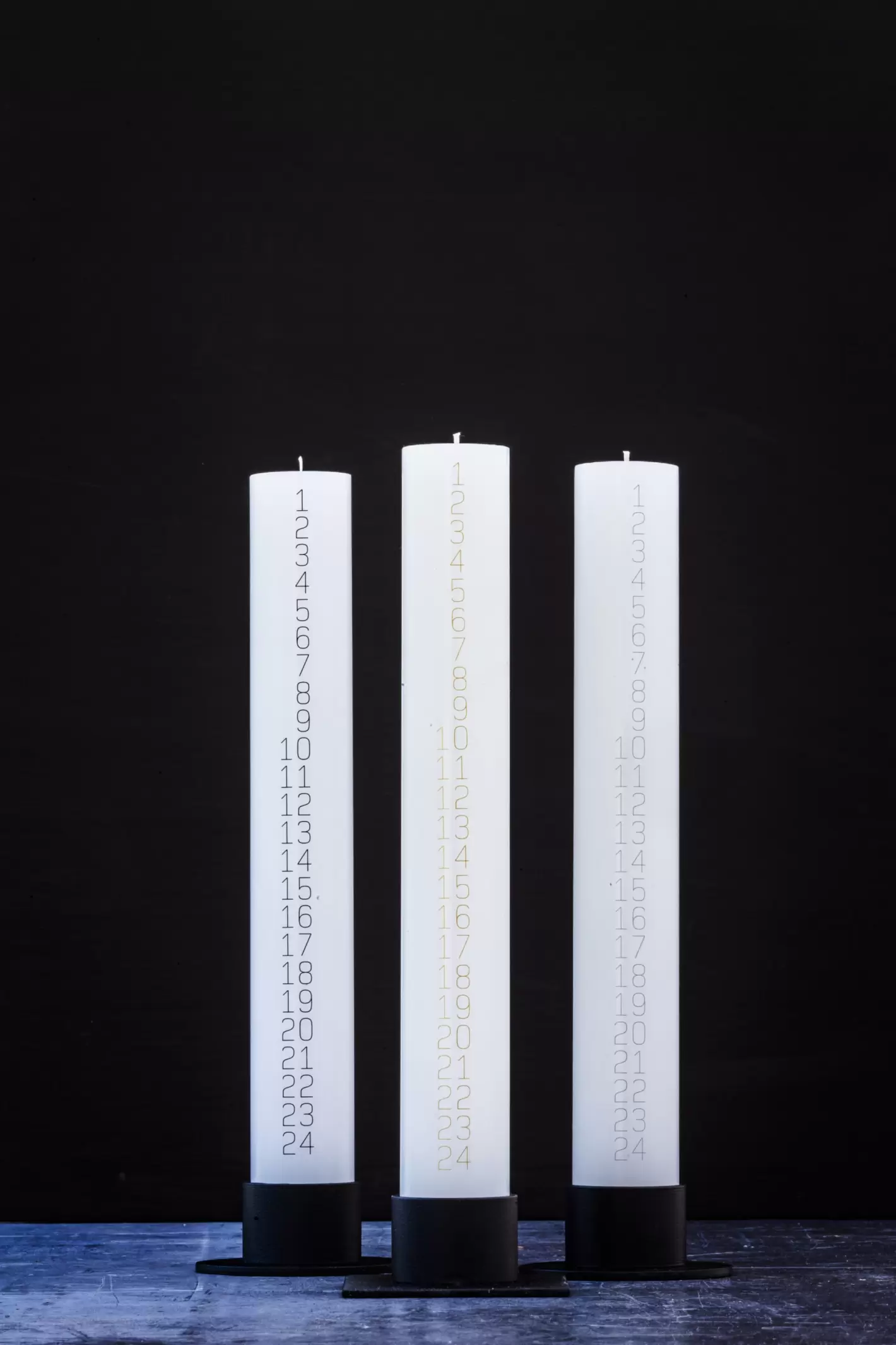 Kunstindustriens voksalterlys er blevet klædt på til højtiden - det høje smukke lys har fået spinkle sorte- eller røde tal, som hjælper os med nedtællingen til jul.