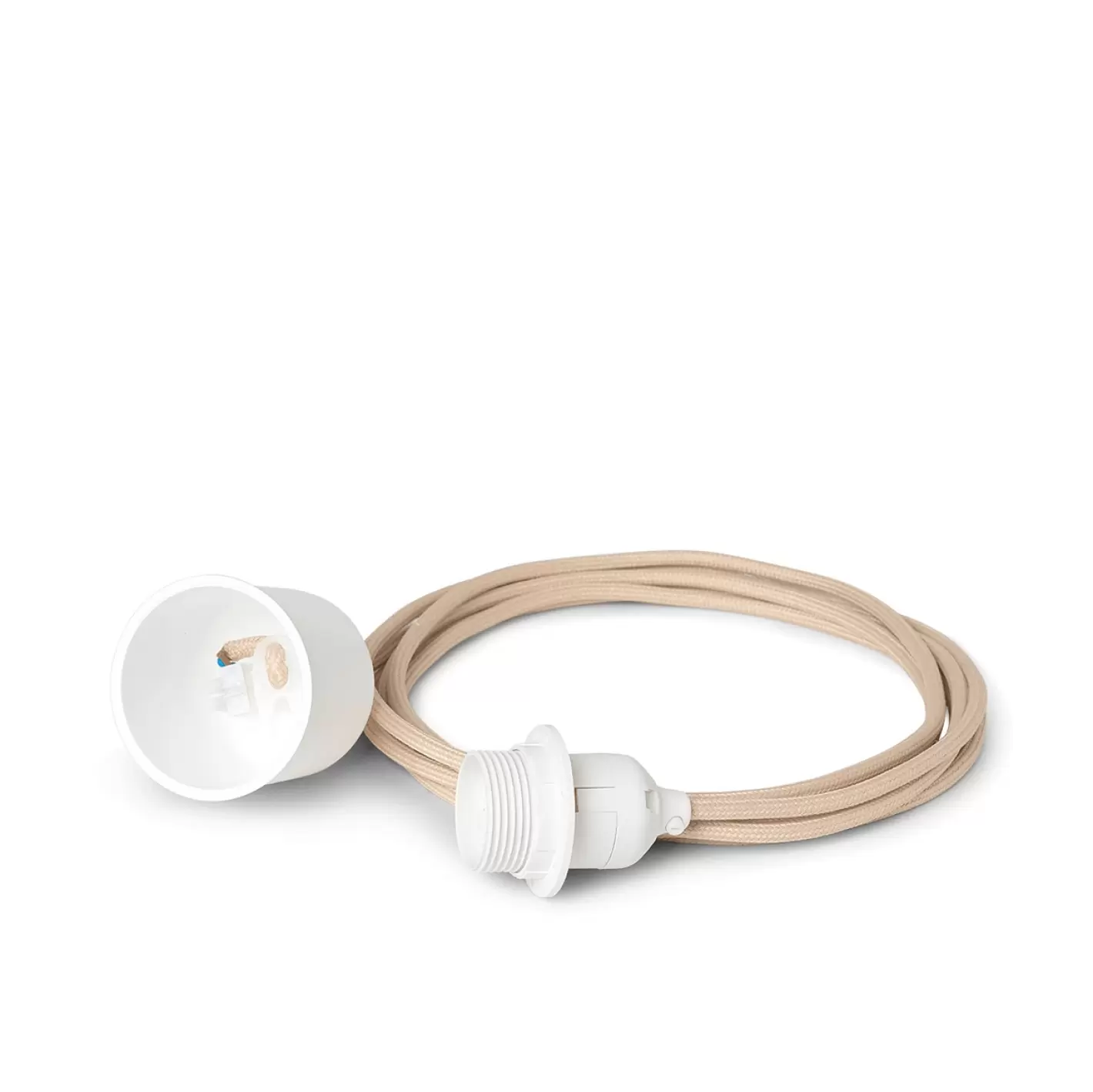 Komplet sæt med 4 meter sandfarvet stofledning, E27 fatning og baldakin af hvid plast. -