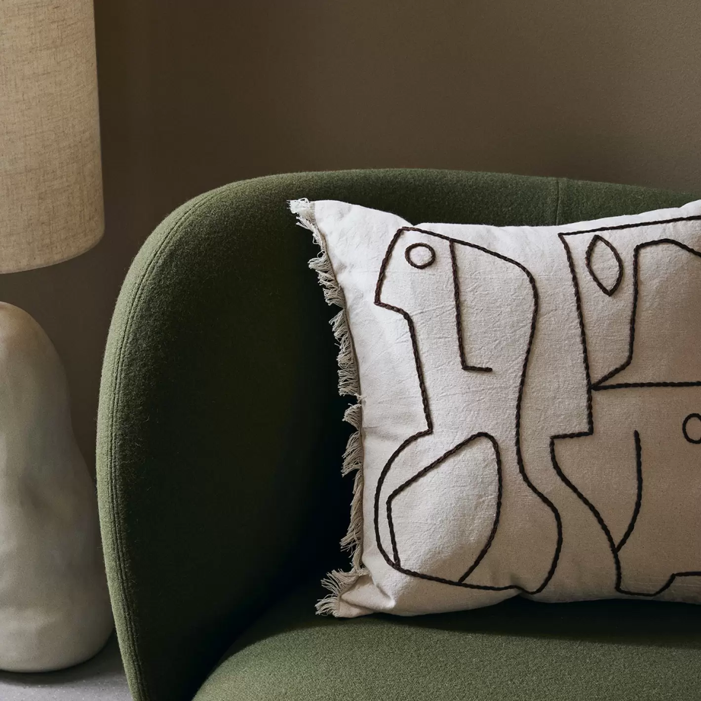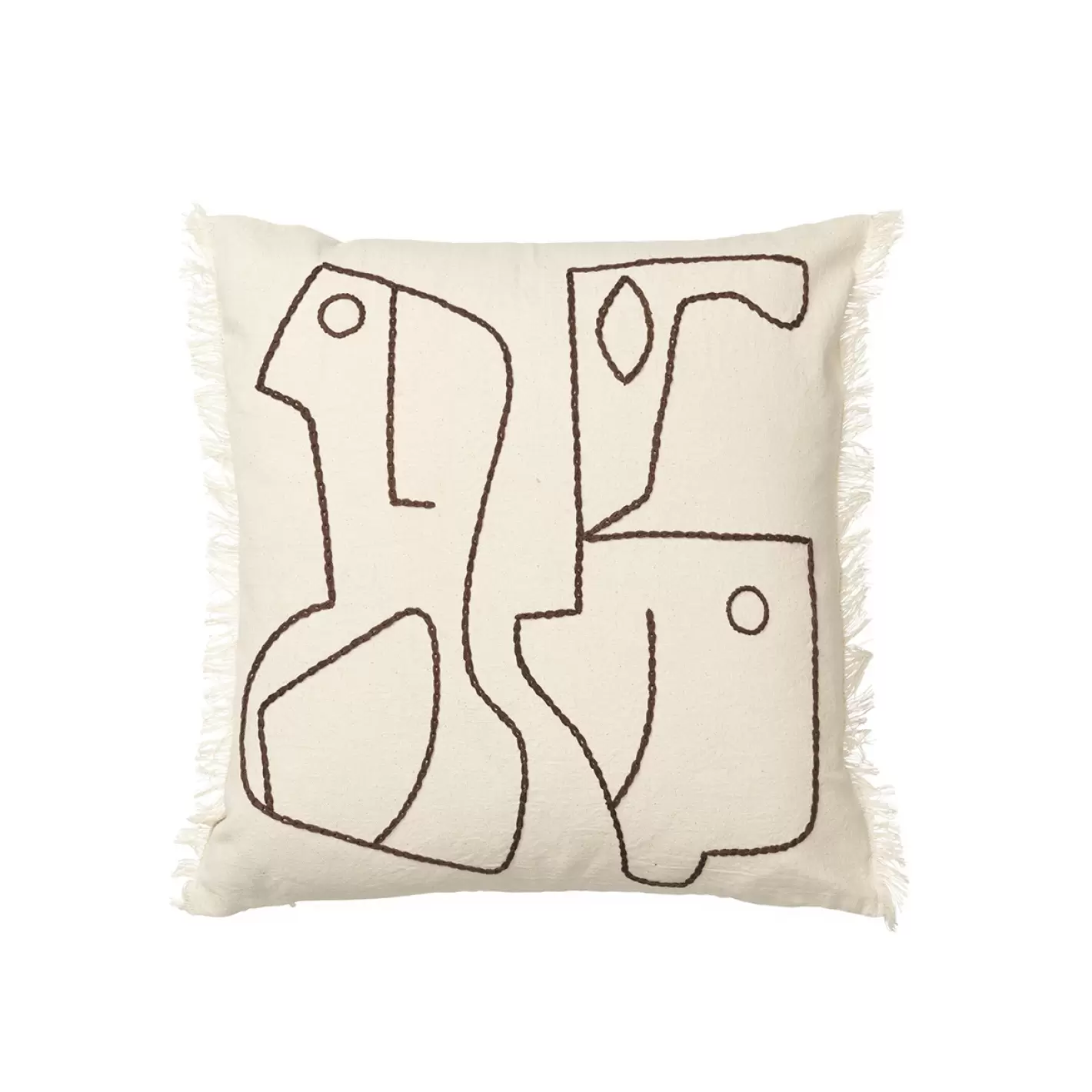 Skab blikfang i indretningen med Ferm skønne pude af råhvidt 100% GOTS-certificeret bomuld med fine håndbroderede abstrakte figurer og små frynsedetaljer på to af siderne.
