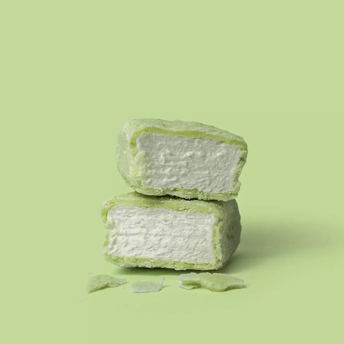 Økologiske vanilje skumfiduser overtrukket med blød hvid chokolade og naturlig pistacie vendt i økologisk spirulina - en ægte lysegrøn forårsmallow.