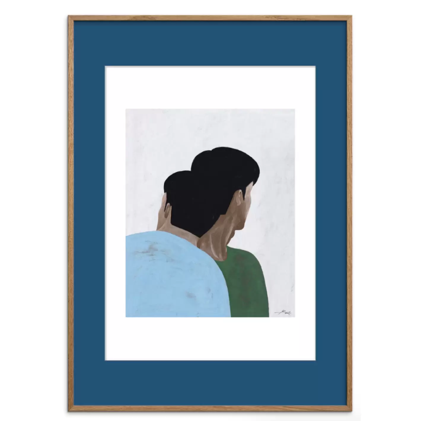 Plakaten har passepartout og ramme af massivt egetræ med glas i front.