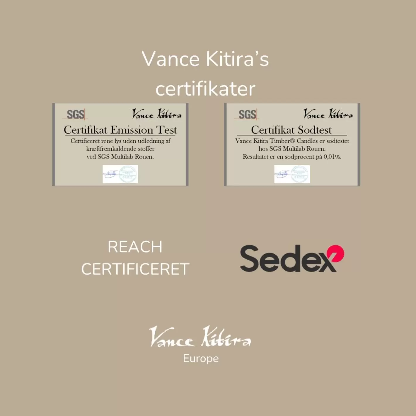 Den anvendte paraffin er fuldstændig renset for urene partikler, en helt klar paraffin som den vi kender fra fødevarer som f.eks. ost, chokolade og kage. Vance Kitiras lys er testet og certificeret på SGS Laboratory i Frankrig, hvor det konkluderes, at lysene er uden nogen kræftfremkaldende partikler og uden problemer kan anvendes af astmatikere og allergikere. Lysene er sodtestede med markedets absolut laveste resultat med en sodprocent på 0,01%.