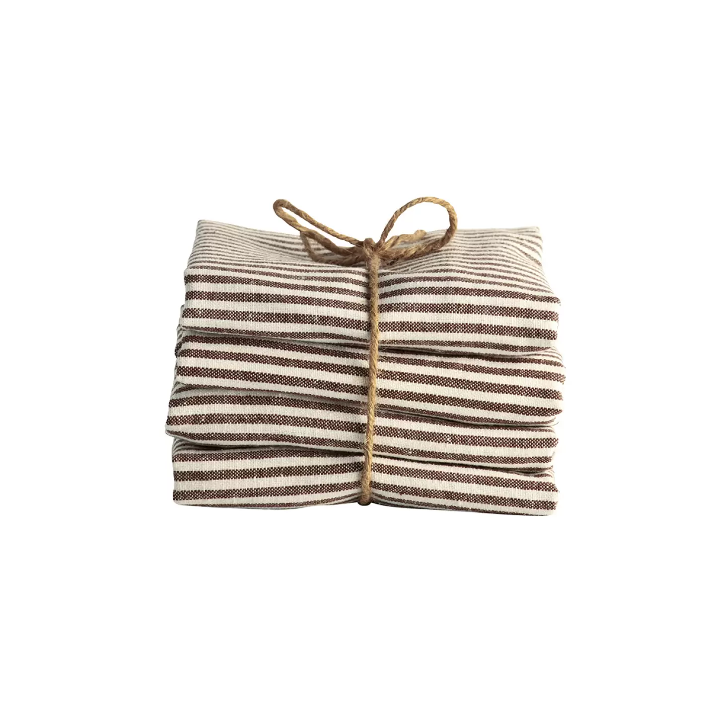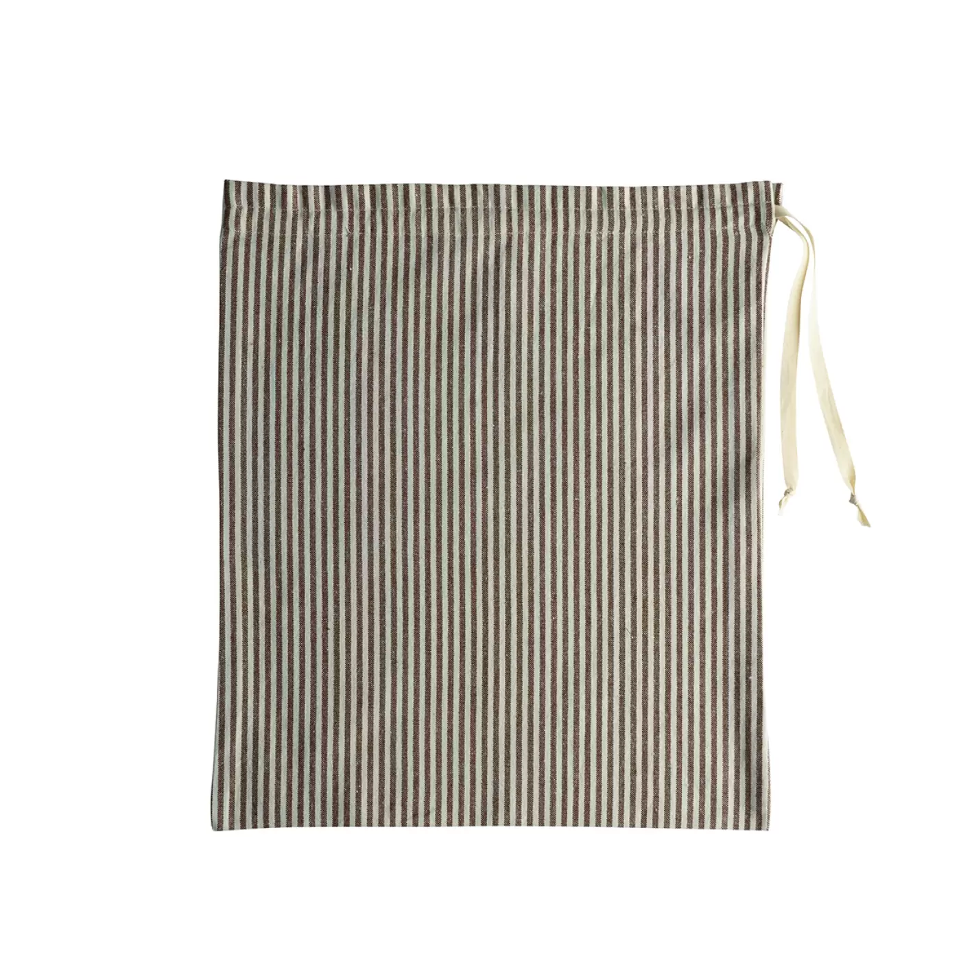 Sæt med fire smalstribede gaveposer af genanvendt bomuld til hurtig og nem indpakning af adventsgaverne - uden brug af engangspapir og tape. Poserne kan genbruges til samme formål år efter år, men er også anvendelige til opbevaring af sko eller som frugtposer.