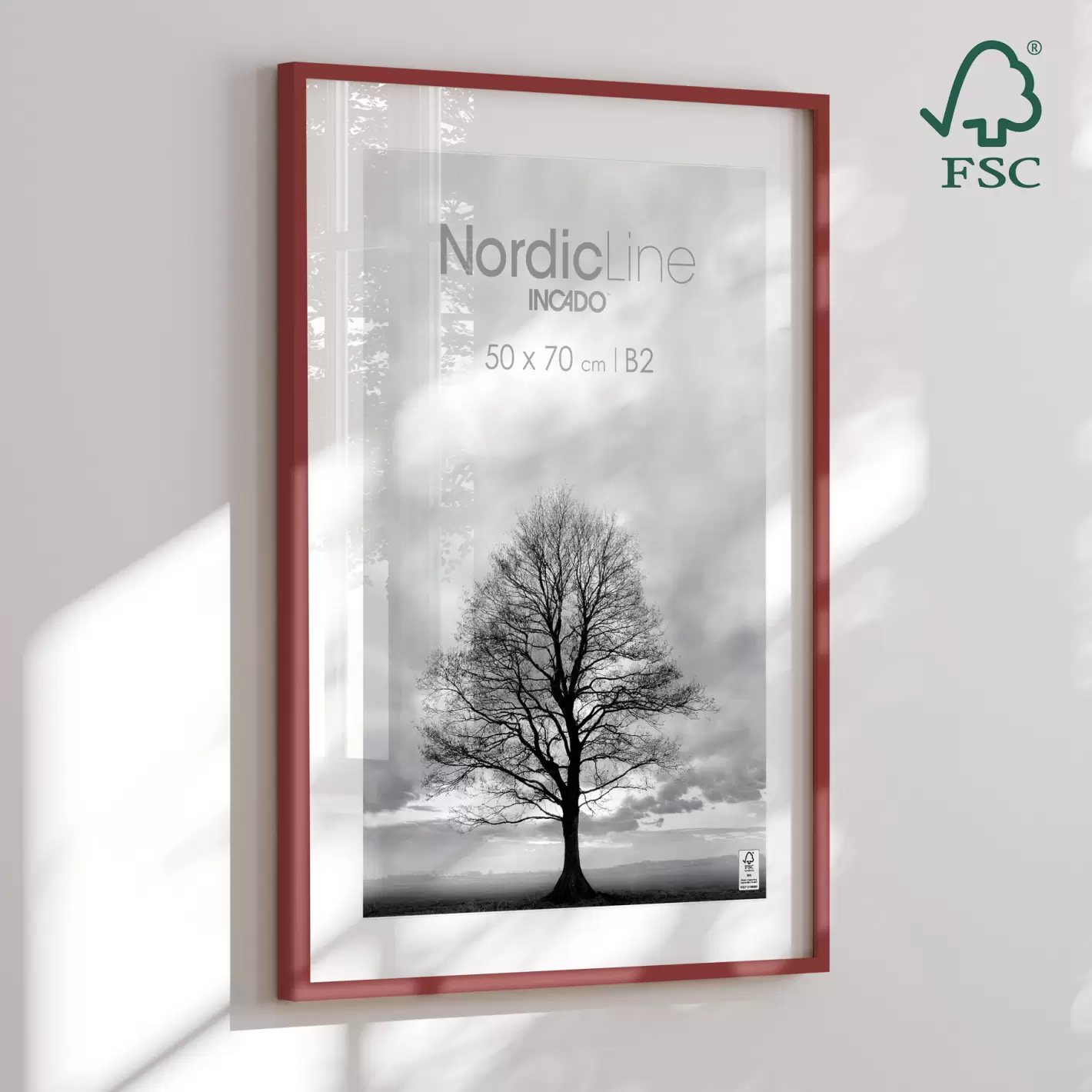 Flot billedramme af FSC-certificeret bordeauxfarvet malet fyrretræ, og har front af glas. Den malede overflade har et blødt skær og lader træets naturlige struktur skinne igennem.