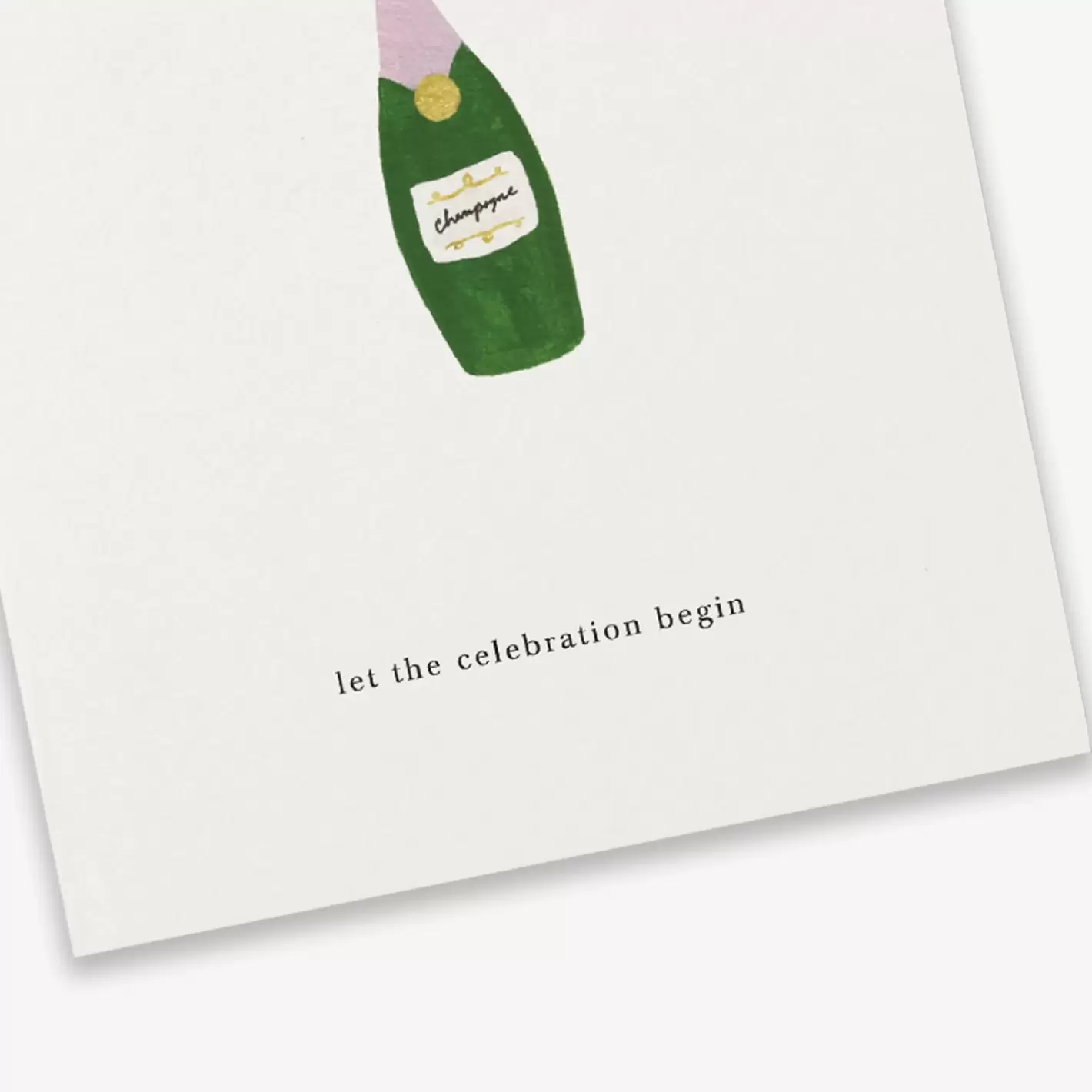 Fint foldekort med konvolut og illustration af en champagneflaske med teksten "Let the celebration begin".