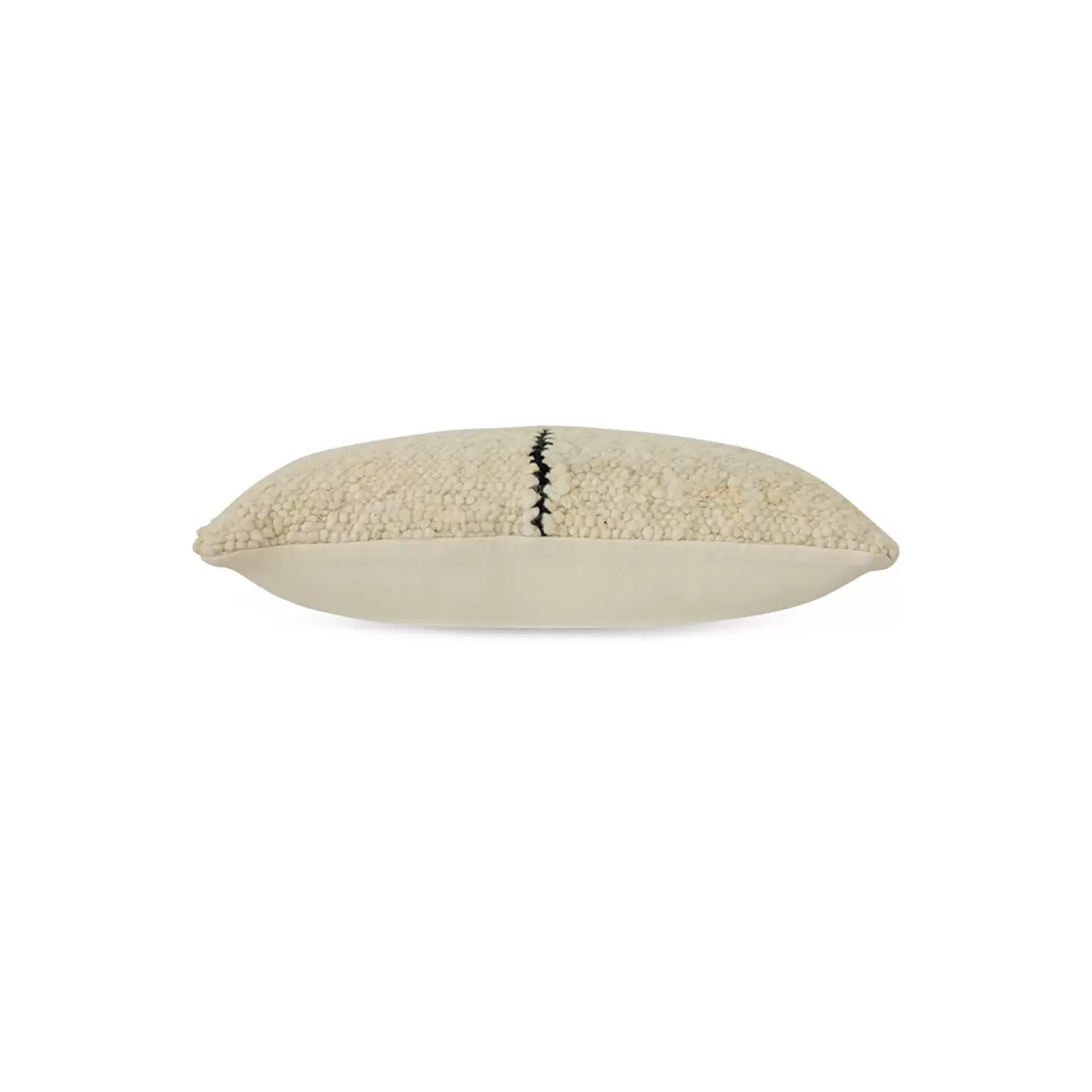 Pudebetrækket er bouclévævet af 80% uld og 20% bomuld i en fin råhvid tone med en sort kontrast, der som et optisk bedrag former en lodret revne i pudens midte. Inderpuden er fremstillet af polyesterfibre.