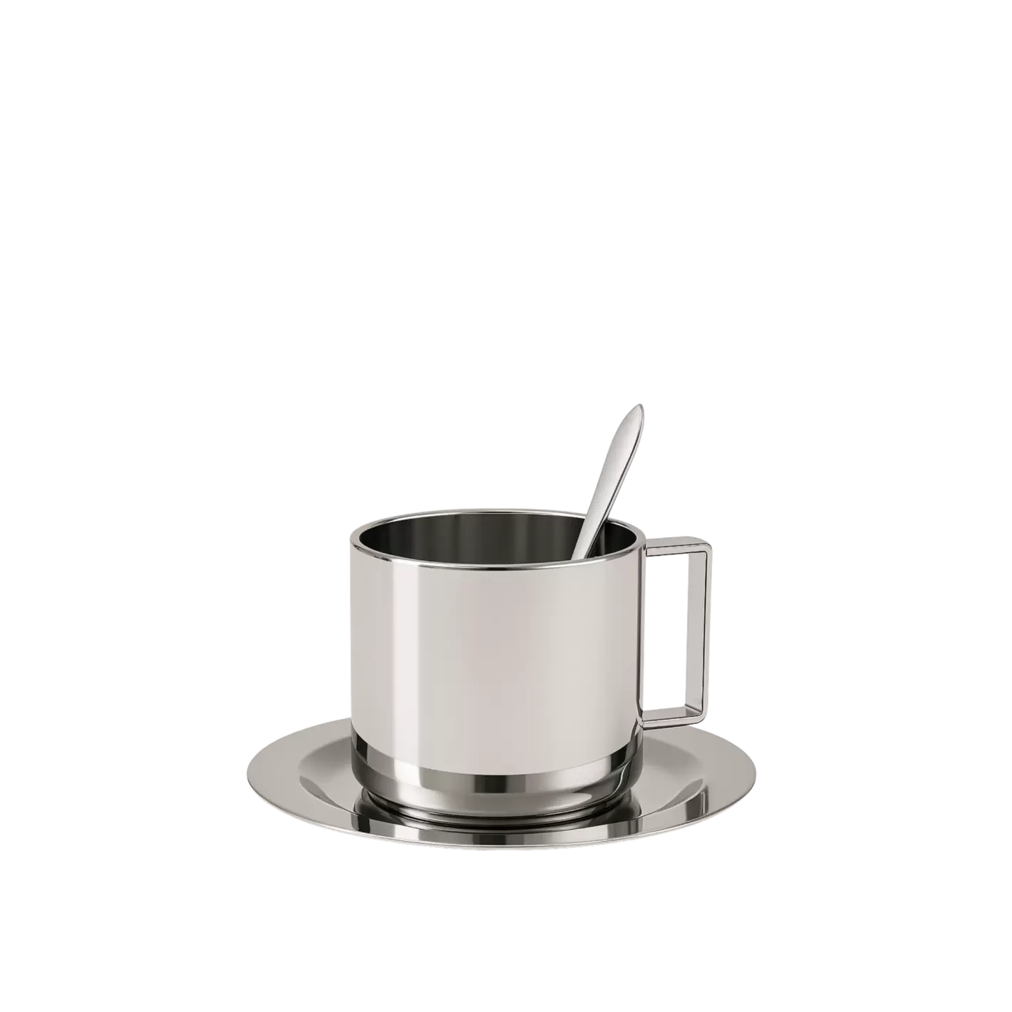 Nichbas trio er tiltænkt en god kop sort Americano kaffe, som kan nydes af denne super elegante termokop med tilhørende underkop og teske af poleret rustfrit stål - et sæt som er en oplagt gaveidé til alle kaffeelskere, og alle der holder af den industrielle stil.