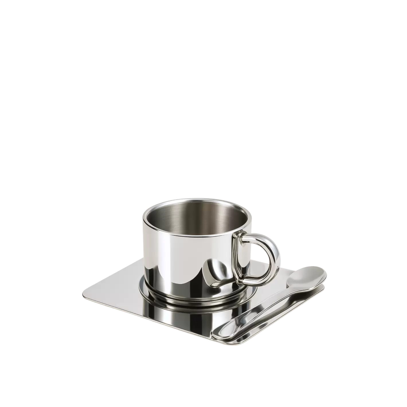 Denne stilrene trio fra Nichba er tiltænkt en god kop cappuccino eller bare helt almindelig kaffe, som kan nydes af den super elegante termokop med tilhørende kvadratisk underkop, som har et fint udskåret spor til den medfølgende teske.