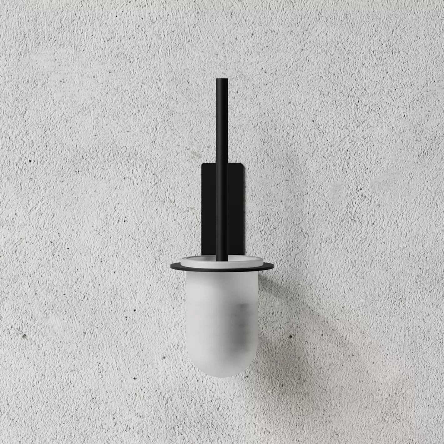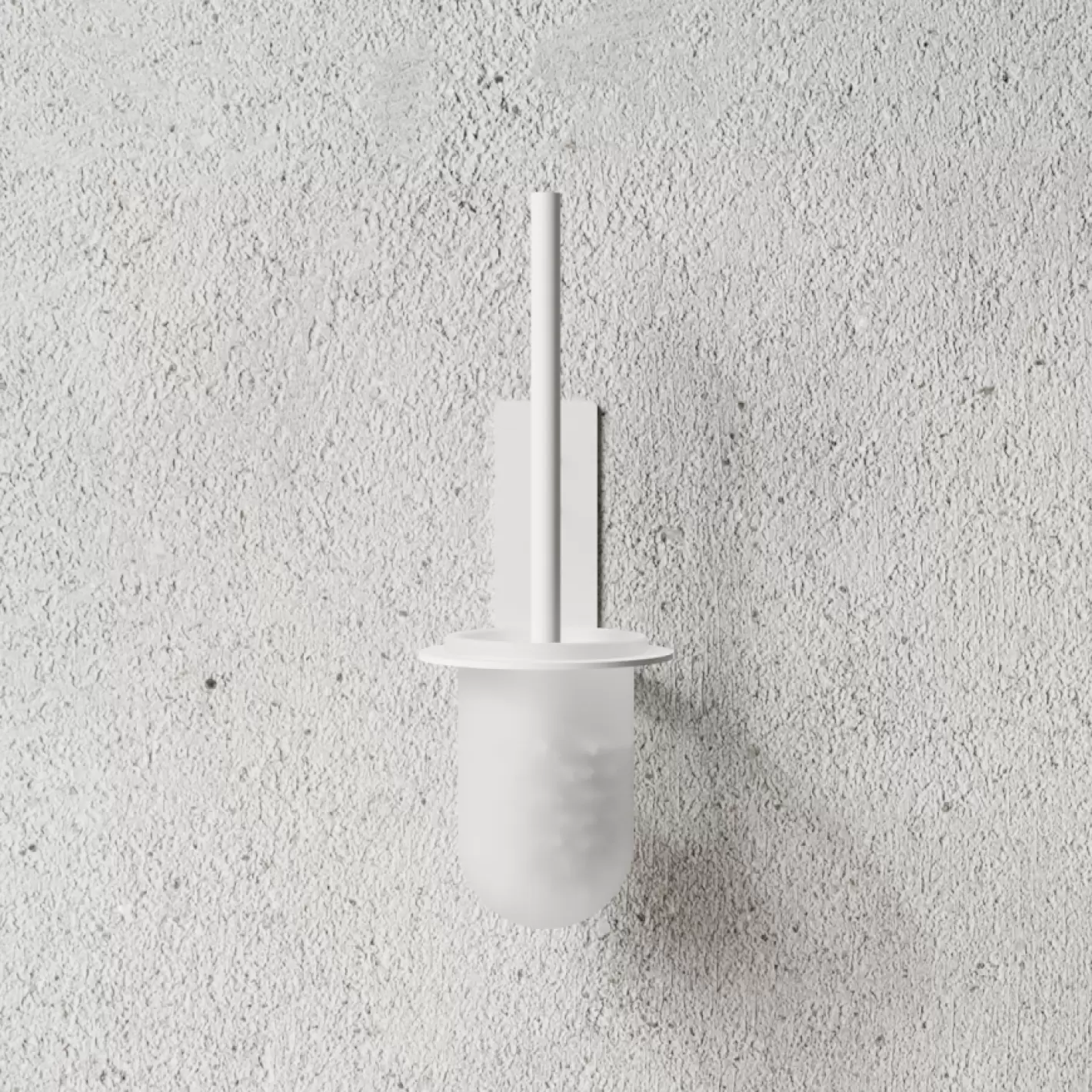 Minimalistisk væghængt toiletbørsteholder med udskifteligt børstehoved, hvor vægbeslag og skaft er fremstillet af pulverlakeret stål, skålen af håndlavet frosted glas og børstehovedet af polypropylen.