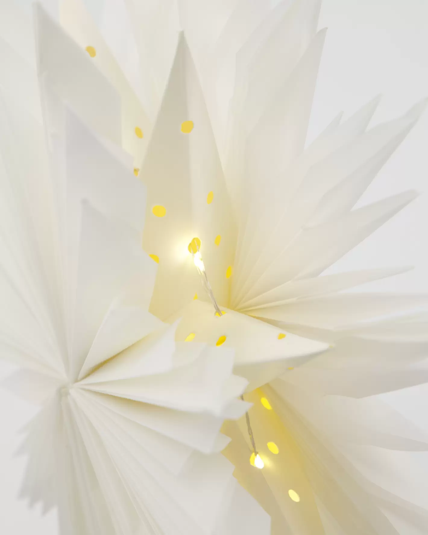 Kronen på værket er stjernen i træets top, som i år har en helt magisk glød, for House Doctors smukke topstjerne har små LED-pærer, som sender et gyldent lys ud igennem det hvide papir.