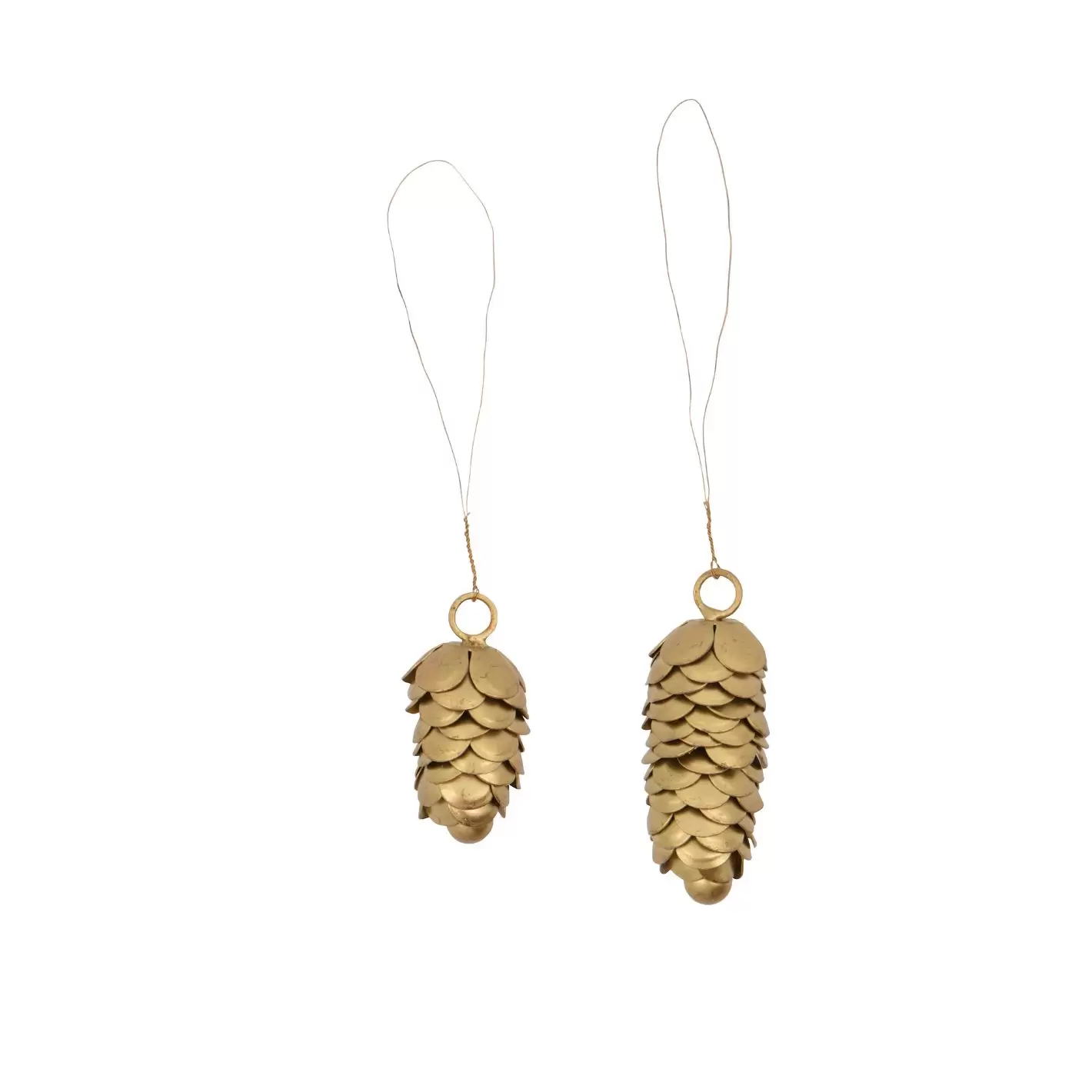 Sæt med 2 håndlavede ornamenter i 2 størrelser formet som de fineste gyldne kogler af metal. Koglerne er virkelig søde på juletræet eller en gren fra skoven.