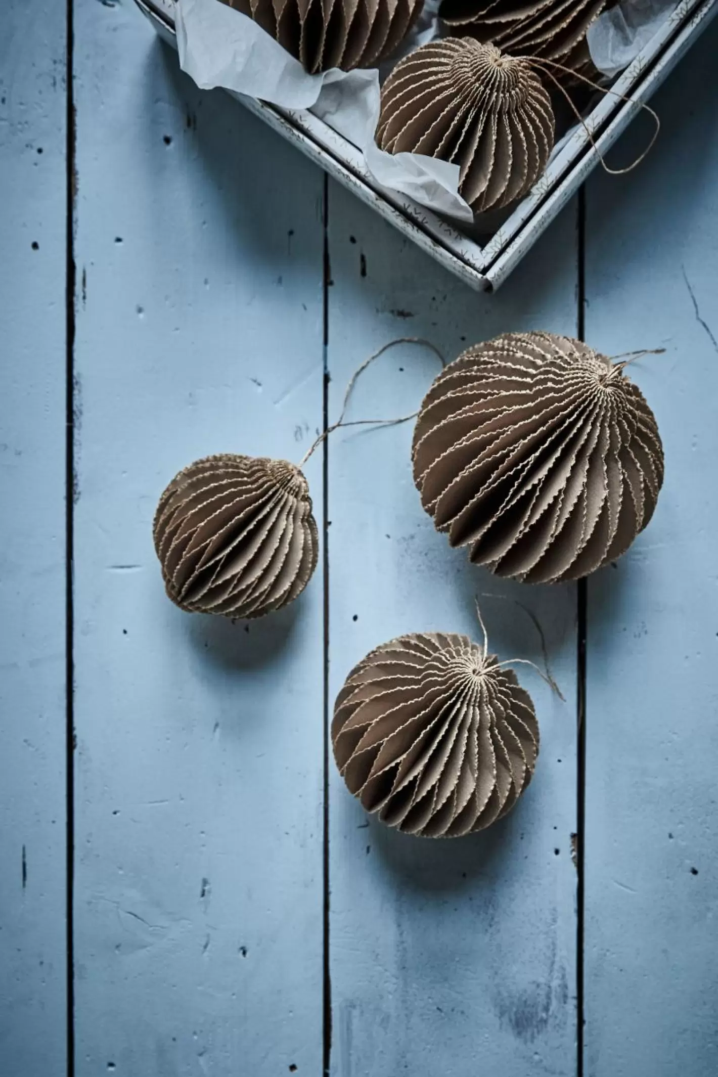 Lad julestemningen brede sig når du pynter juletræet eller en gren fra haven med disse fine ornamenter af papir i en varm brun nuance, hvor kanterne har fået et drys af gyldent glimmer.