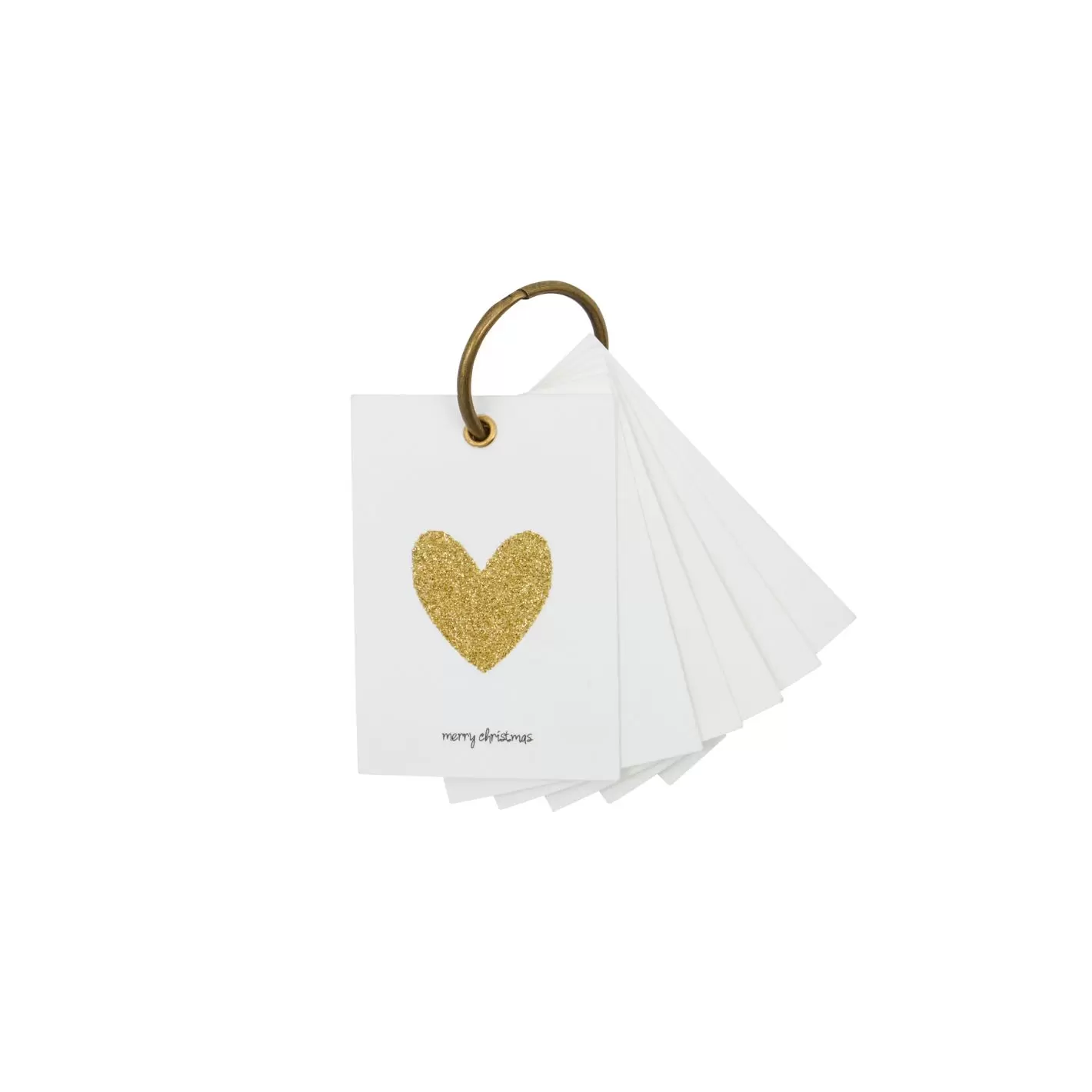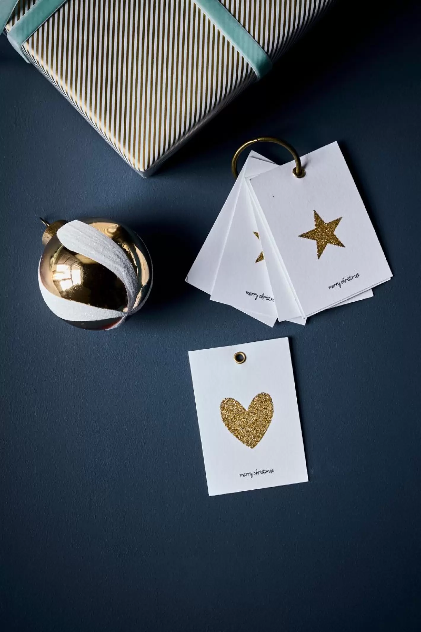 House Doctors fine til-og-fra kort af hvidt karton bærer teksten "Merry Christmas" og har søde motiver af et hjerte, en stjerne og et juletræ i guldglimmer - du får 4 kort af hvert motiv.