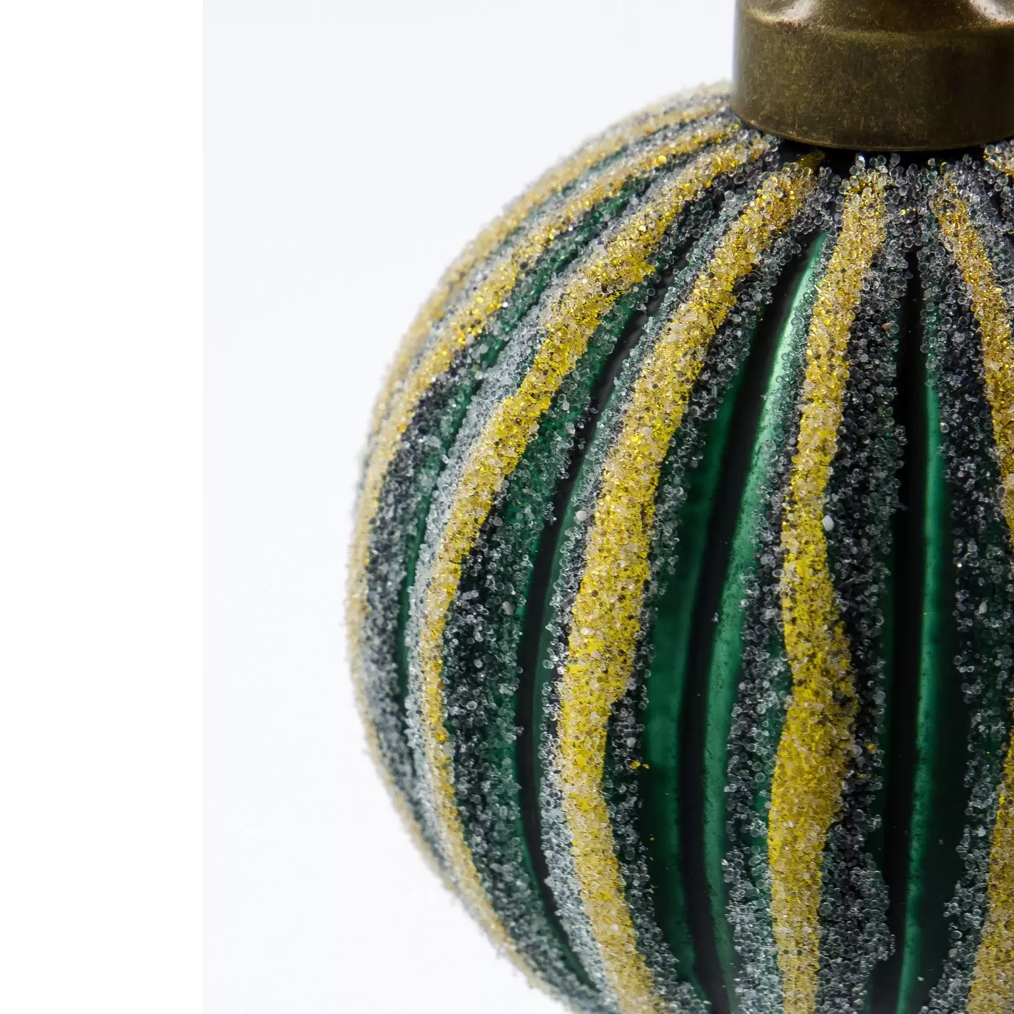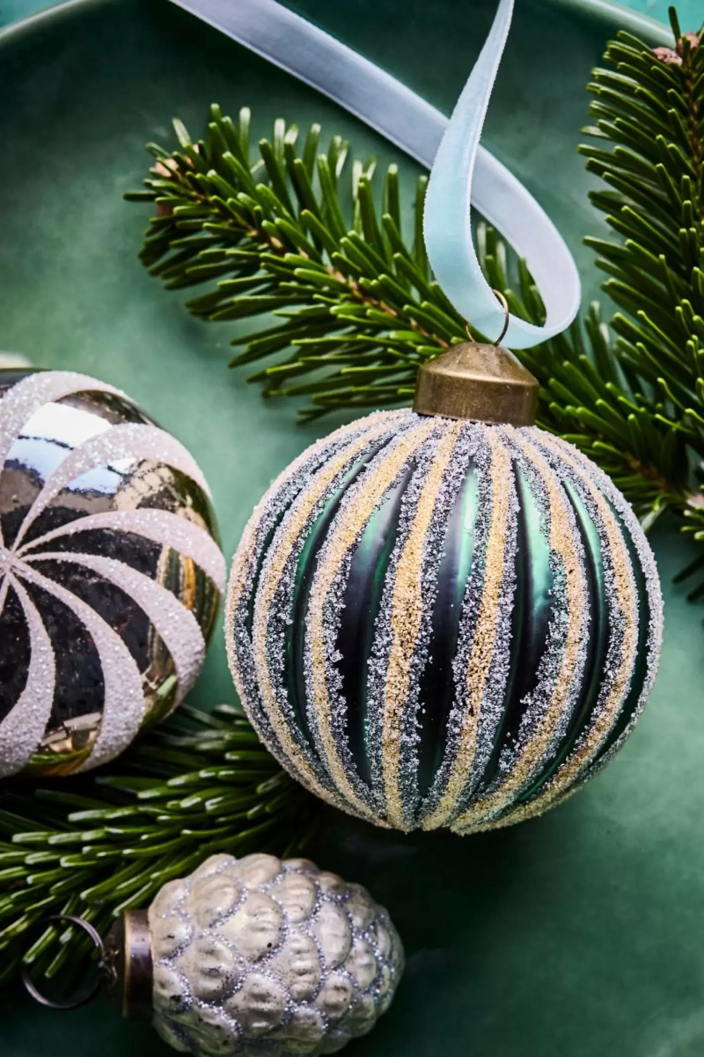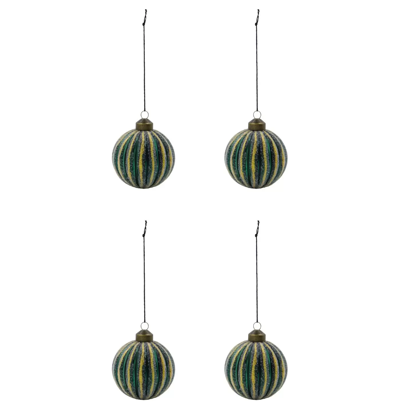 Sæt med 4 klassiske mundblæste julekugler af glas i fine grønne nuancer med lodrette hvide striber der giver kuglerne et strejf af frost.