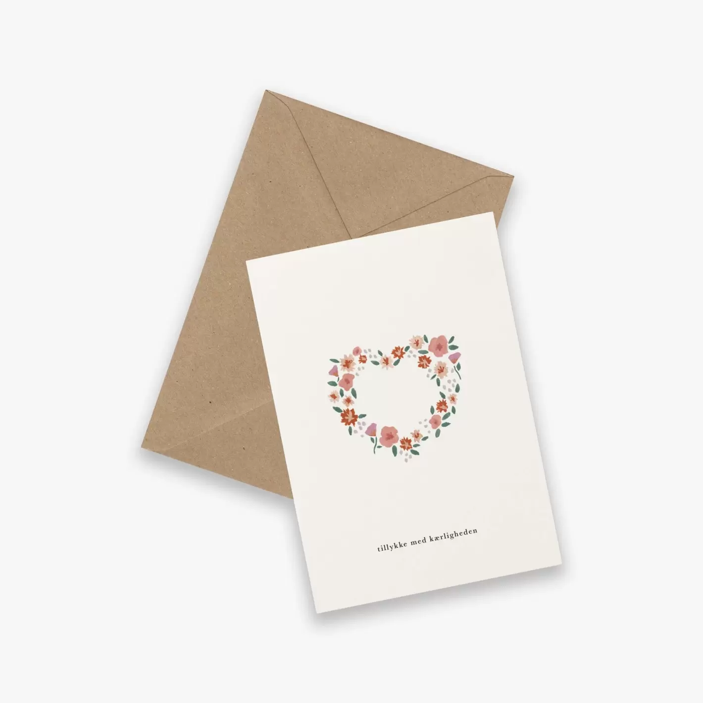 Sødt foldekort med konvolut og illustration af en fin hjerteformet blomsterkrans til kæreste- eller brudeparret med teksten "Tillykke med kærligheden".