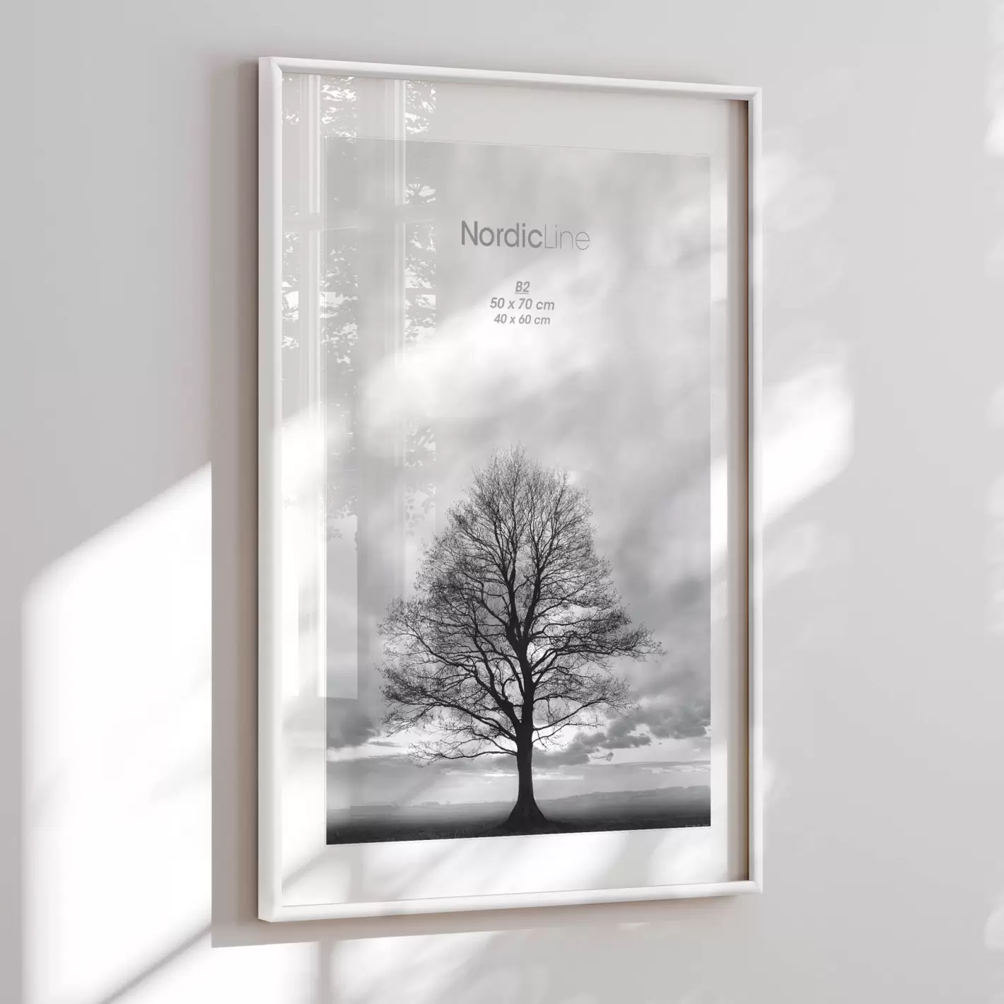 Helt enkel billedramme i hvidlakeret aluminium. Rammen har glas i front, og passer til billeder med målene 30 x 40 cm., hvor billedet vil gå helt til kant.