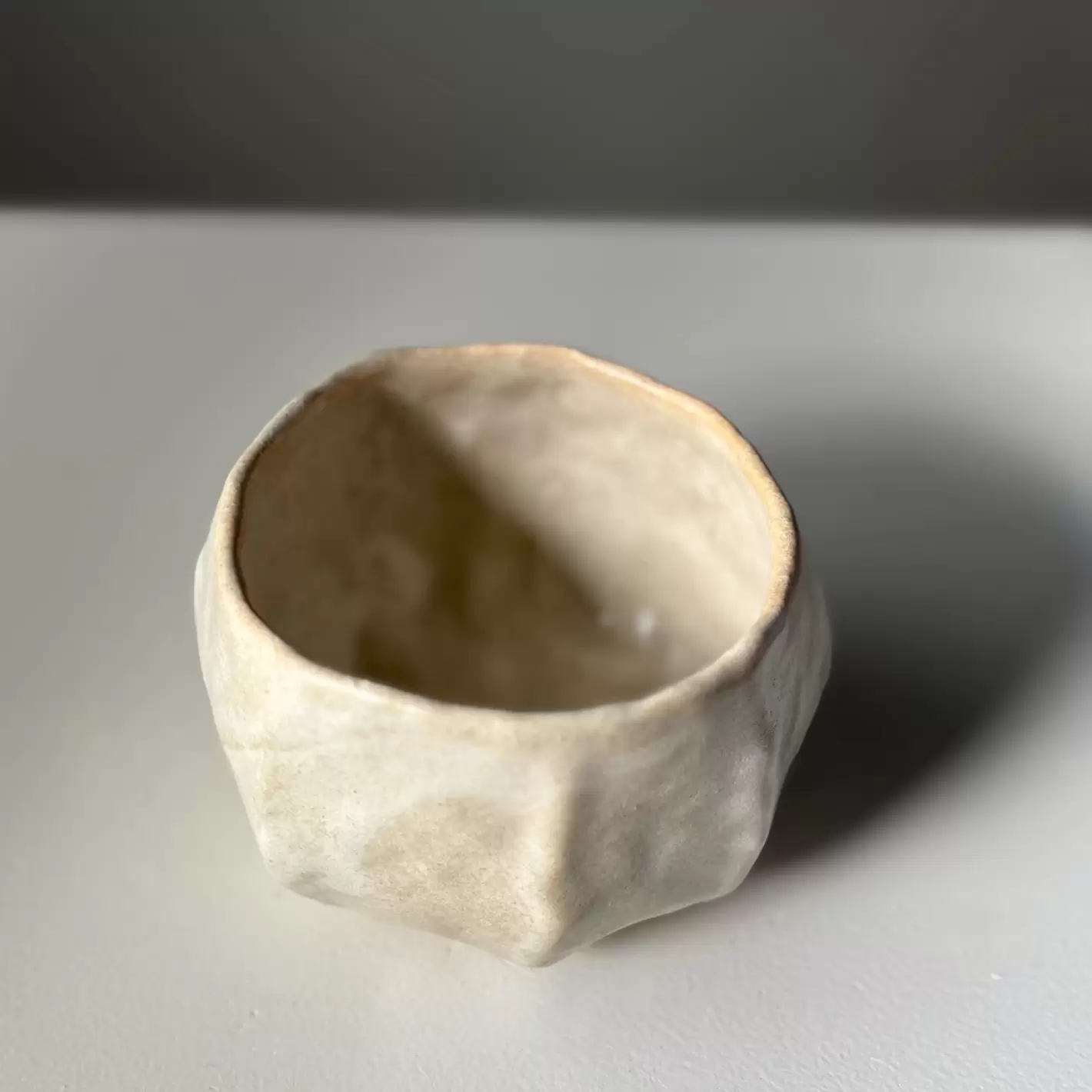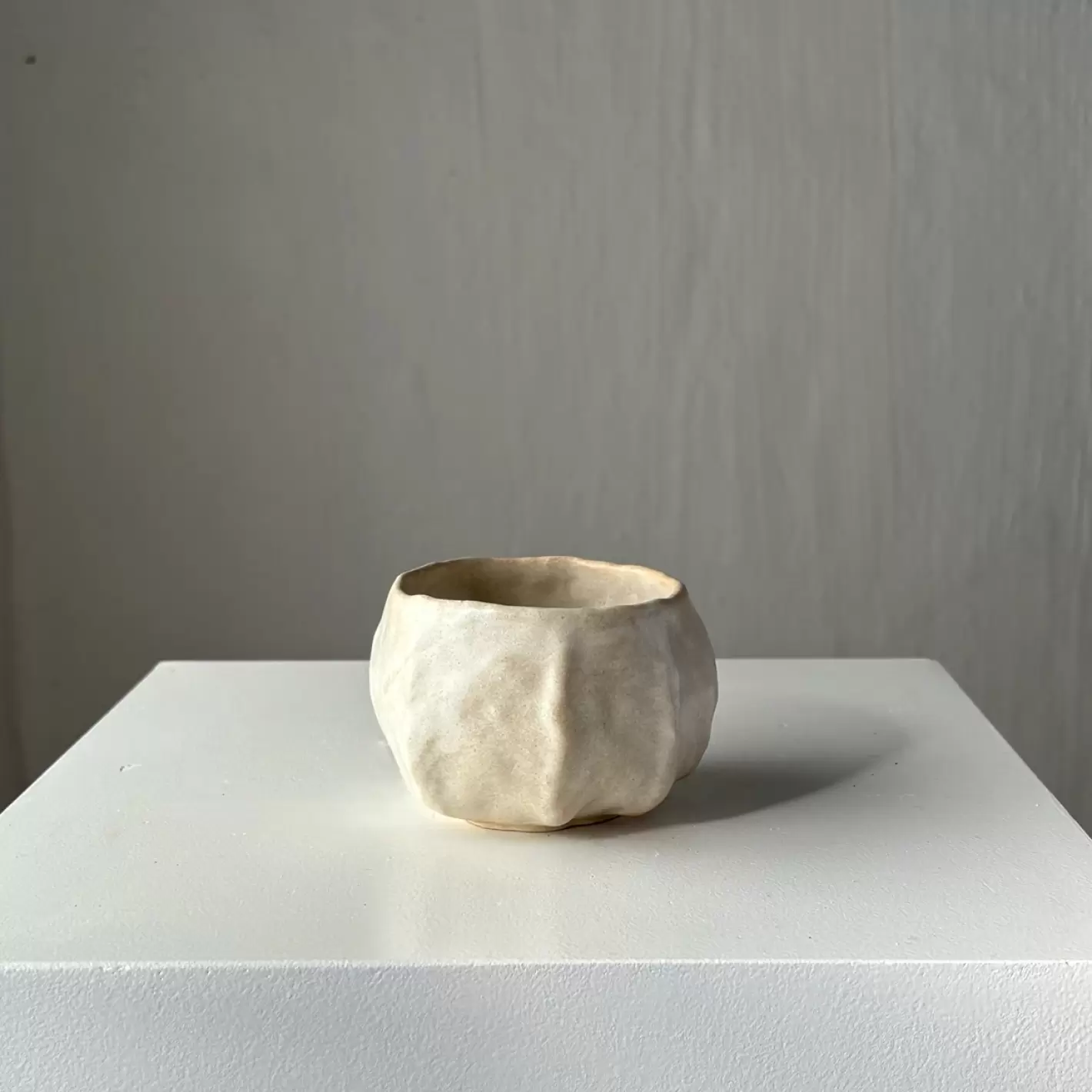 Håndlavet unika kop, i 100% genanvendt ler, af Leela Mette. Den er glaseret i en smuk beige silkemat glausur der lader den uperfekte form træde frem.