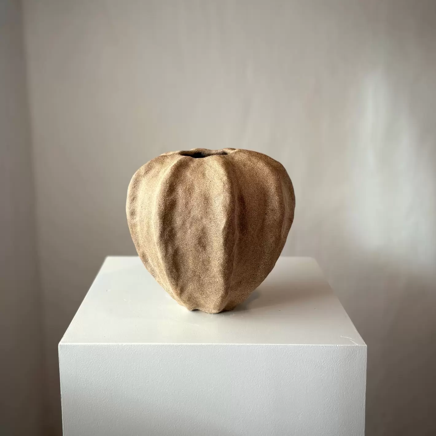 Håndbygget skulpturel unika vase i brunler, af Leela Mette. Vasen er uglaseret hvilket skaber både liv, dybde og tekstur.