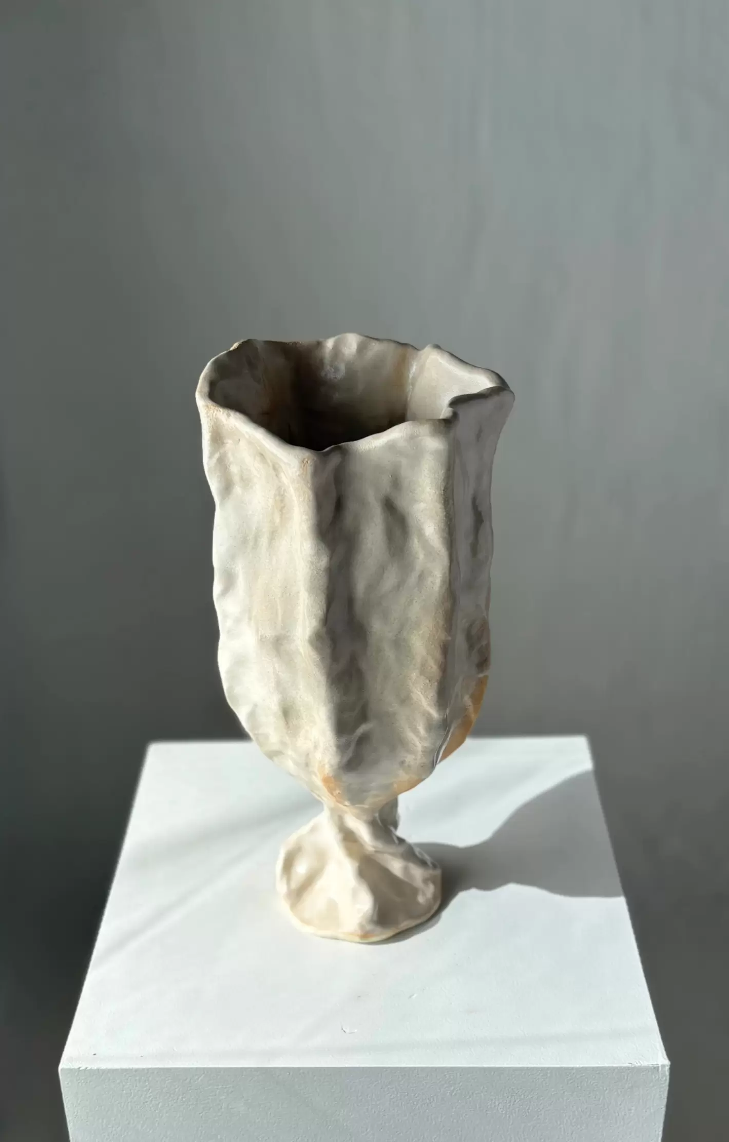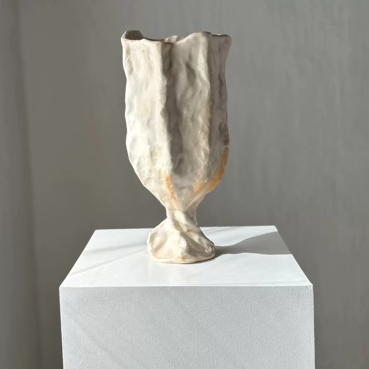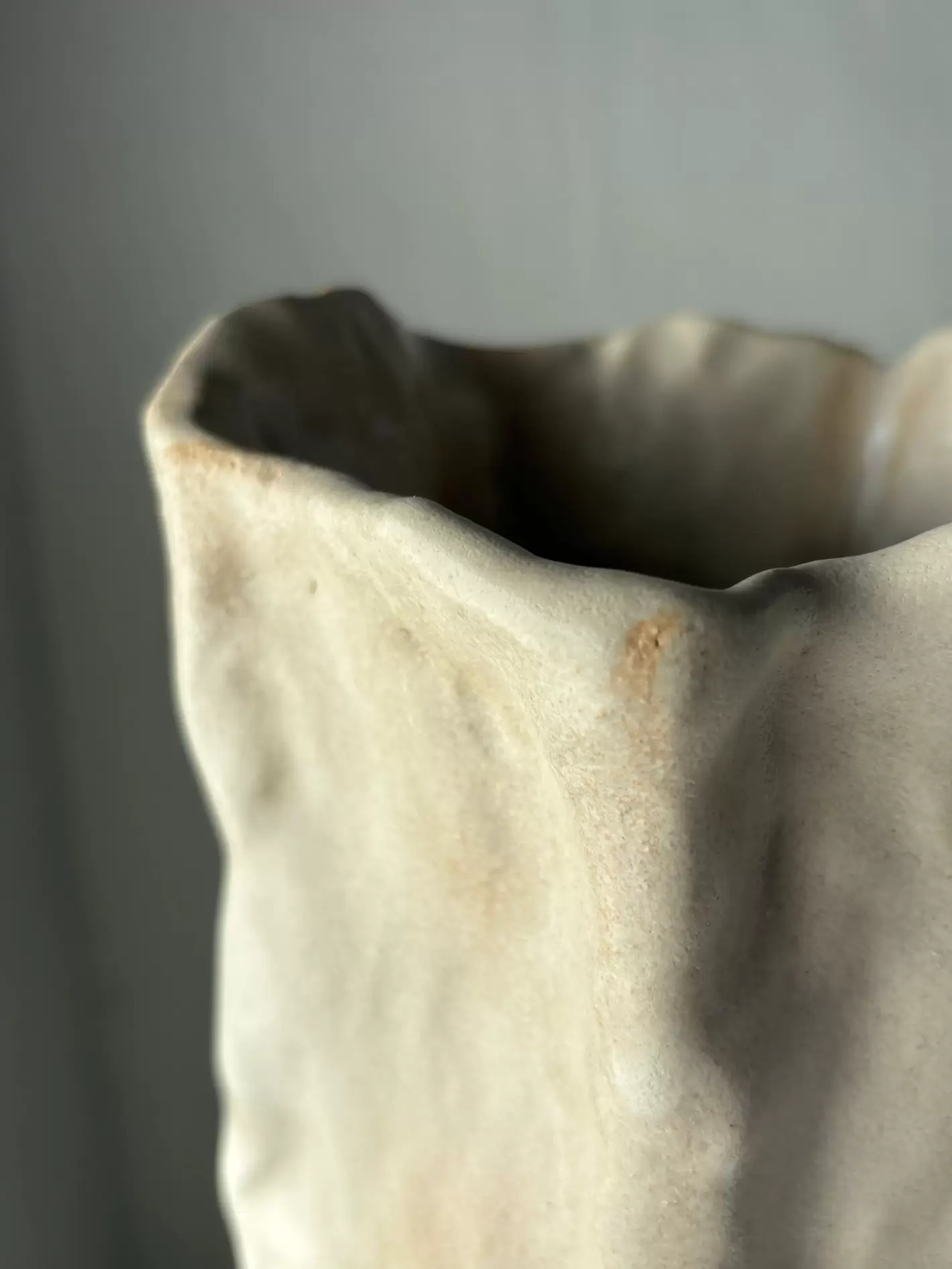 Håndbygget skulpturel unika vase, af Leela Mette. Vasen er glaseret i et tyndt lag beige for et smukt samspil med leret i overfladen.