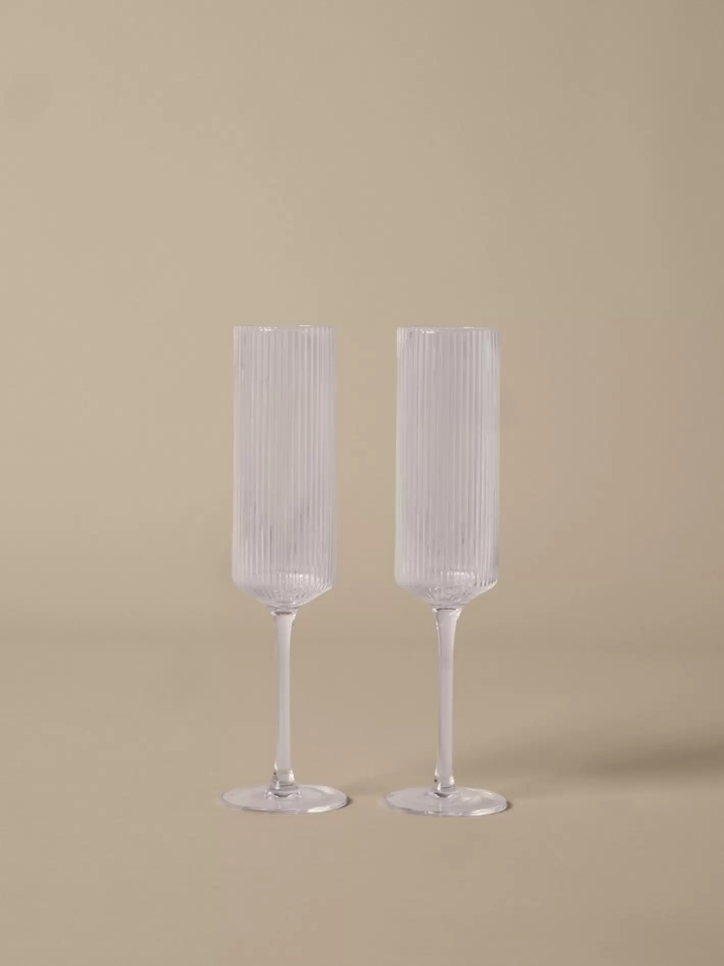 Dette sæt med 2 champagneglas er fremstillet af fint mundblæst glas - her i en elegant høj og slank version. Skab en boblende festlig stemning og server mousserende vine i de smukt formede glas med fint rillet mønster.