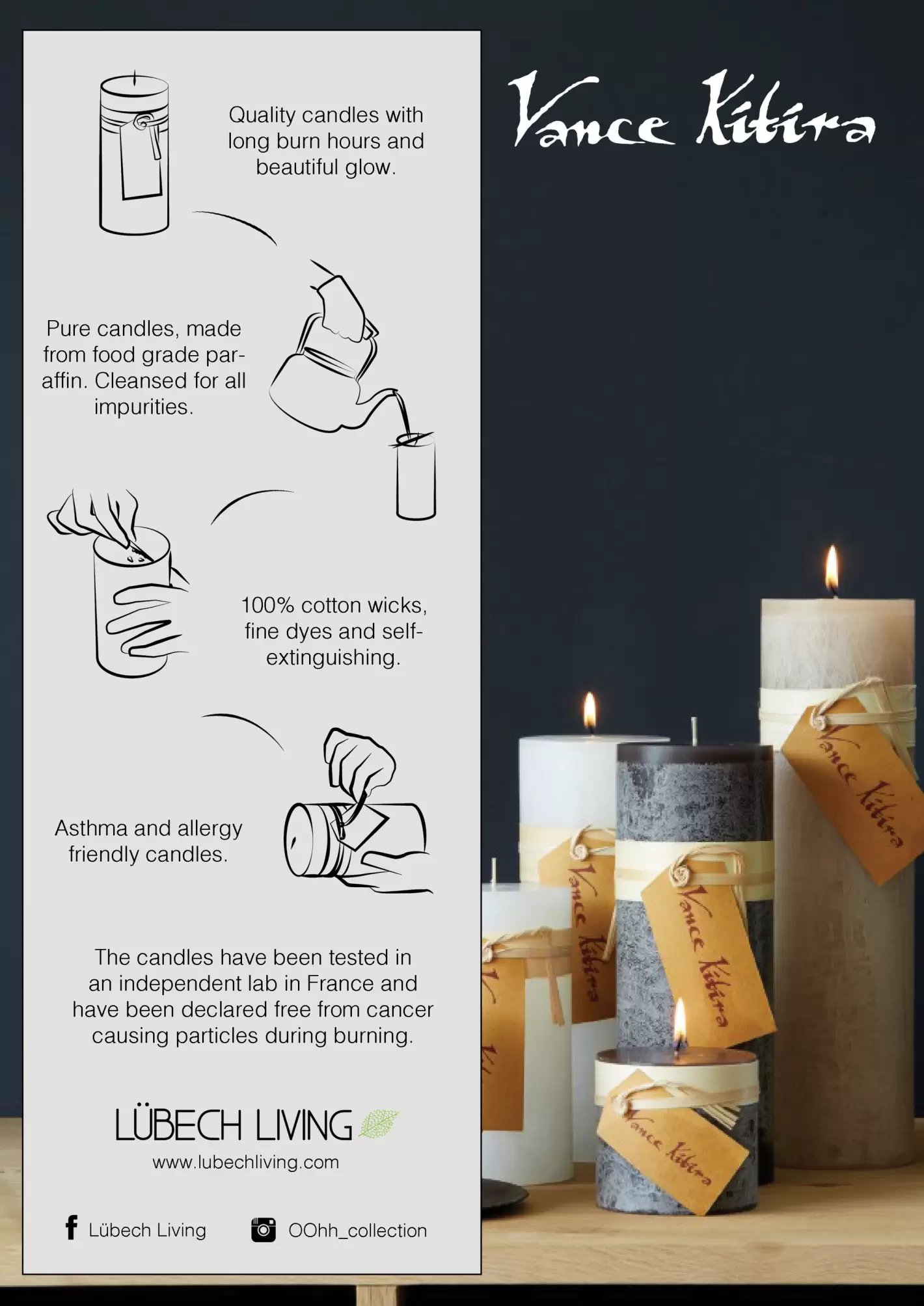 Den anvendte paraffin er fuldstændig renset for urene partikler, en helt klar paraffin som den vi kender fra fødevarer som f.eks. ost, chokolade og kage. Vance Kitiras lys er testet og certificeret på SGS Laboratory i Frankrig, hvor det konkluderes, at lysene er uden nogen kræftfremkaldende partikler og uden problemer kan anvendes af astmatikere og allergikere. Lysene er sodtestede med markedets absolut laveste resultat med en sodprocent på 0,01%.
