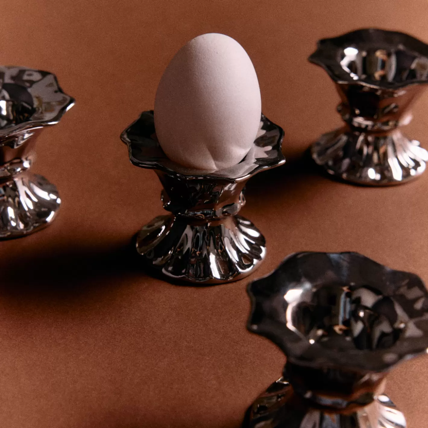 HK Living har gentænkt det klassiske æggebæger i dette sæt af stentøj med forkromet overflade, der minder om poleret aluminium - klassiske former med et overraskende udtryk, der gør morgenbordet til noget helt særligt.
