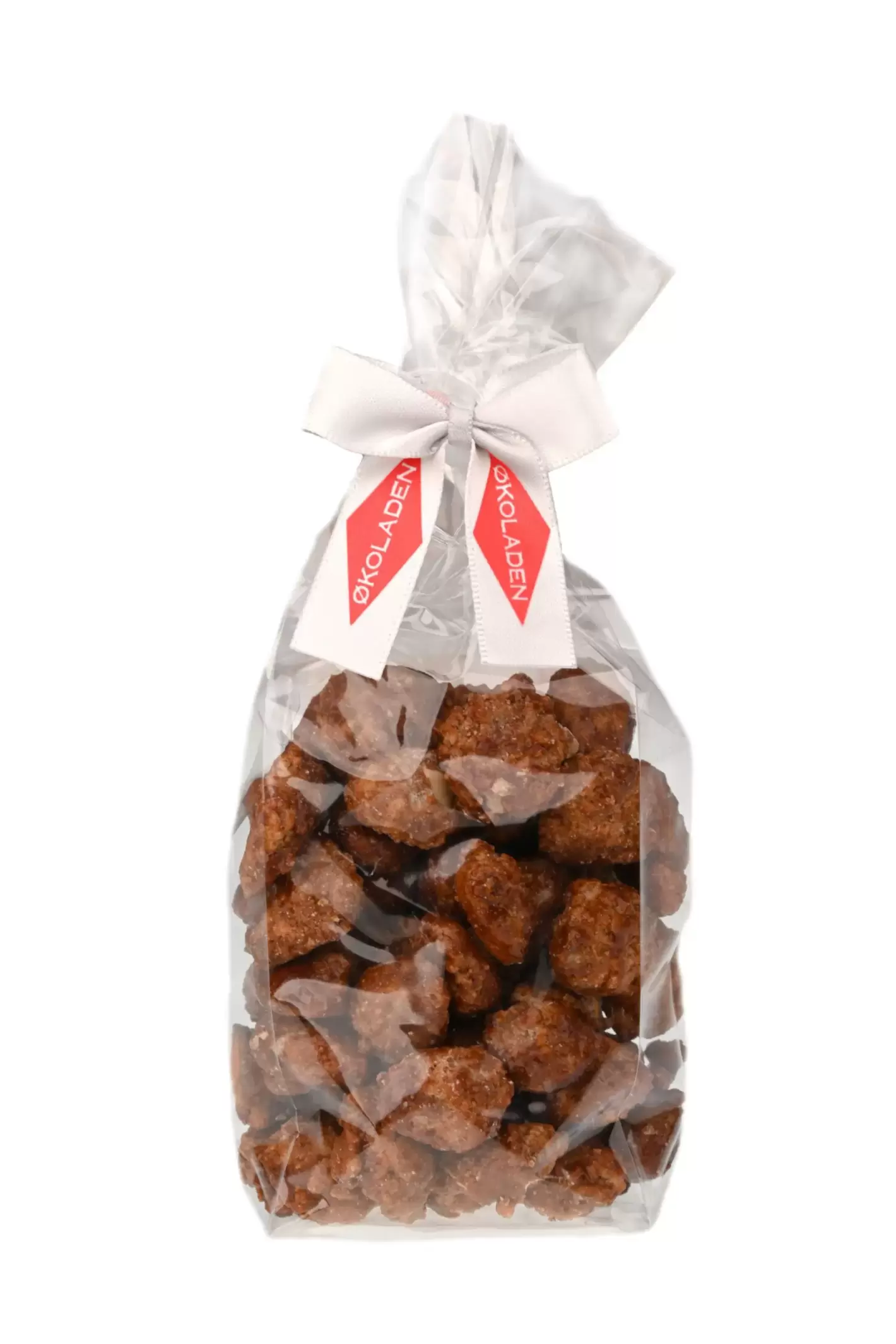 Pose med danskproducerede 100% økologiske brændte mandler som har en fin balance mellem sukker og mandel, så mandelsmagen kommer godt igennem.