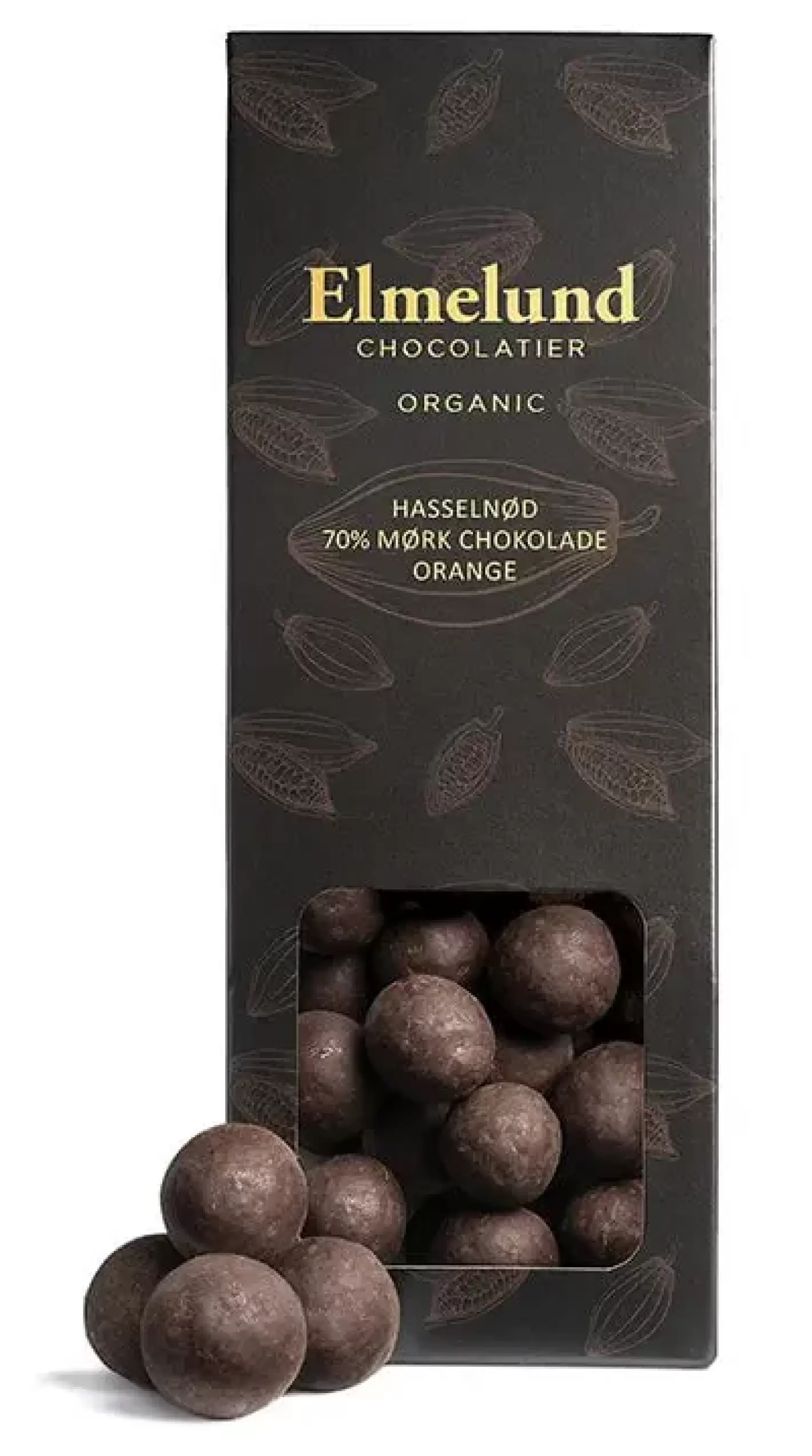 Gaveæske med danskproducerede 100% økologiske sprøde hasselnøder dragéret med 70% mørk chokolade og orange. Orangeolien er rørt i chokoladen, så man får den gennemtrængende og lækre smag af orange gennem hele smagsoplevelsen.