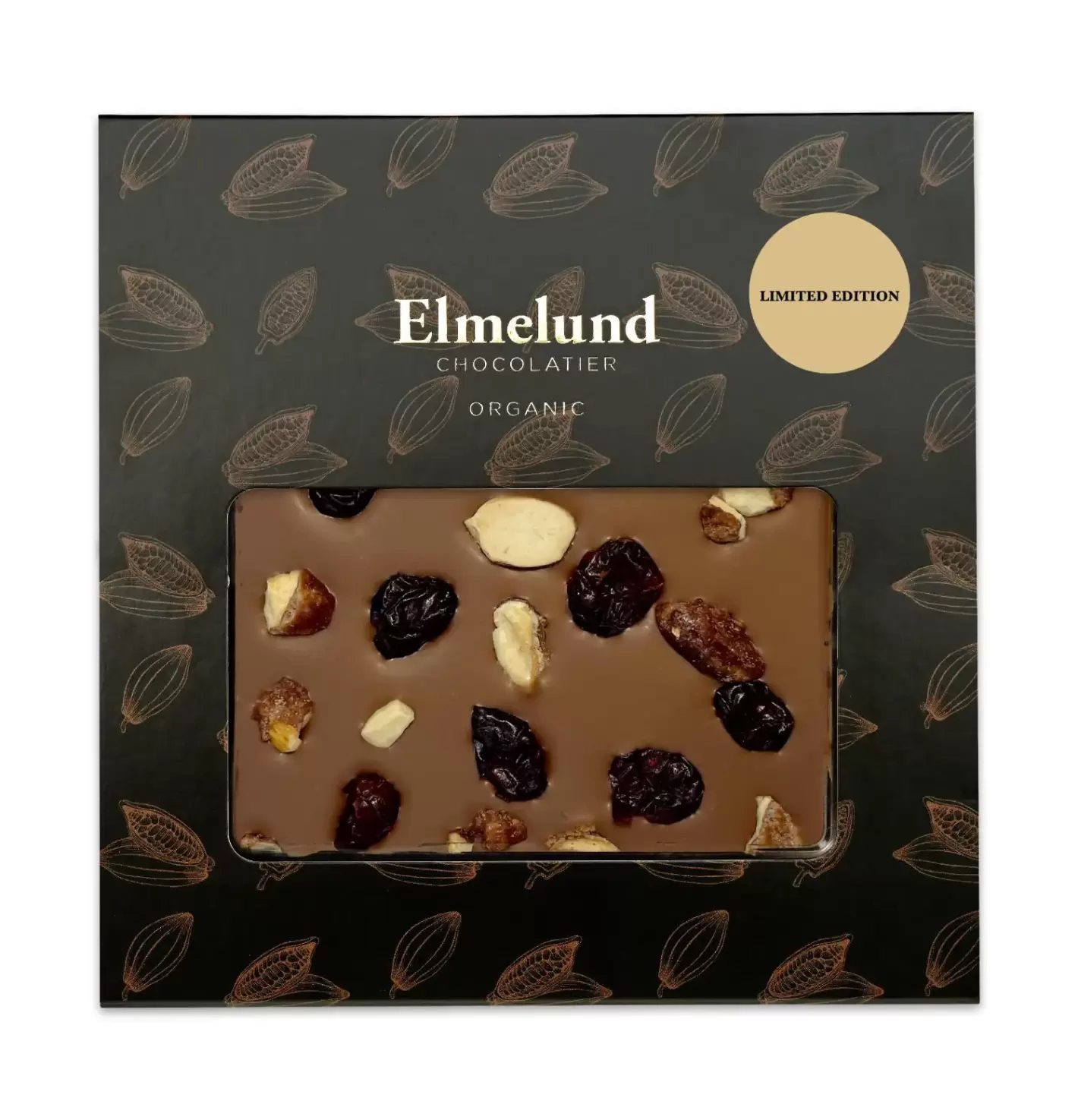 Danskproduceret 100% økologisk chokoladeplade med 41% mælkechokolade pyntet med tranebær og brændte mandler - en perfekt julekombination, som kun er produceret i et begrænset antal.