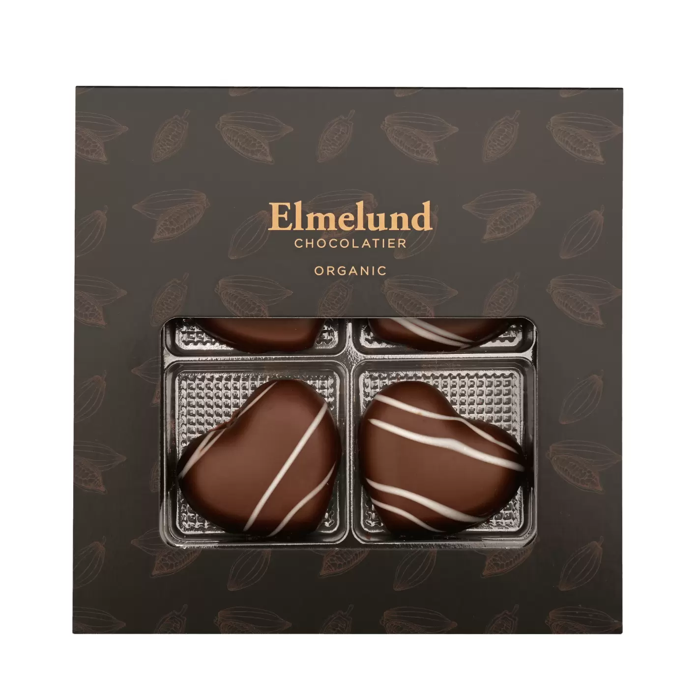 Gaveæske med 4 stk. danskproducerede 100% økologiske marcipanhjerter med økologisk 72% mørk chokolade hånddekoreret med hvid chokolade.