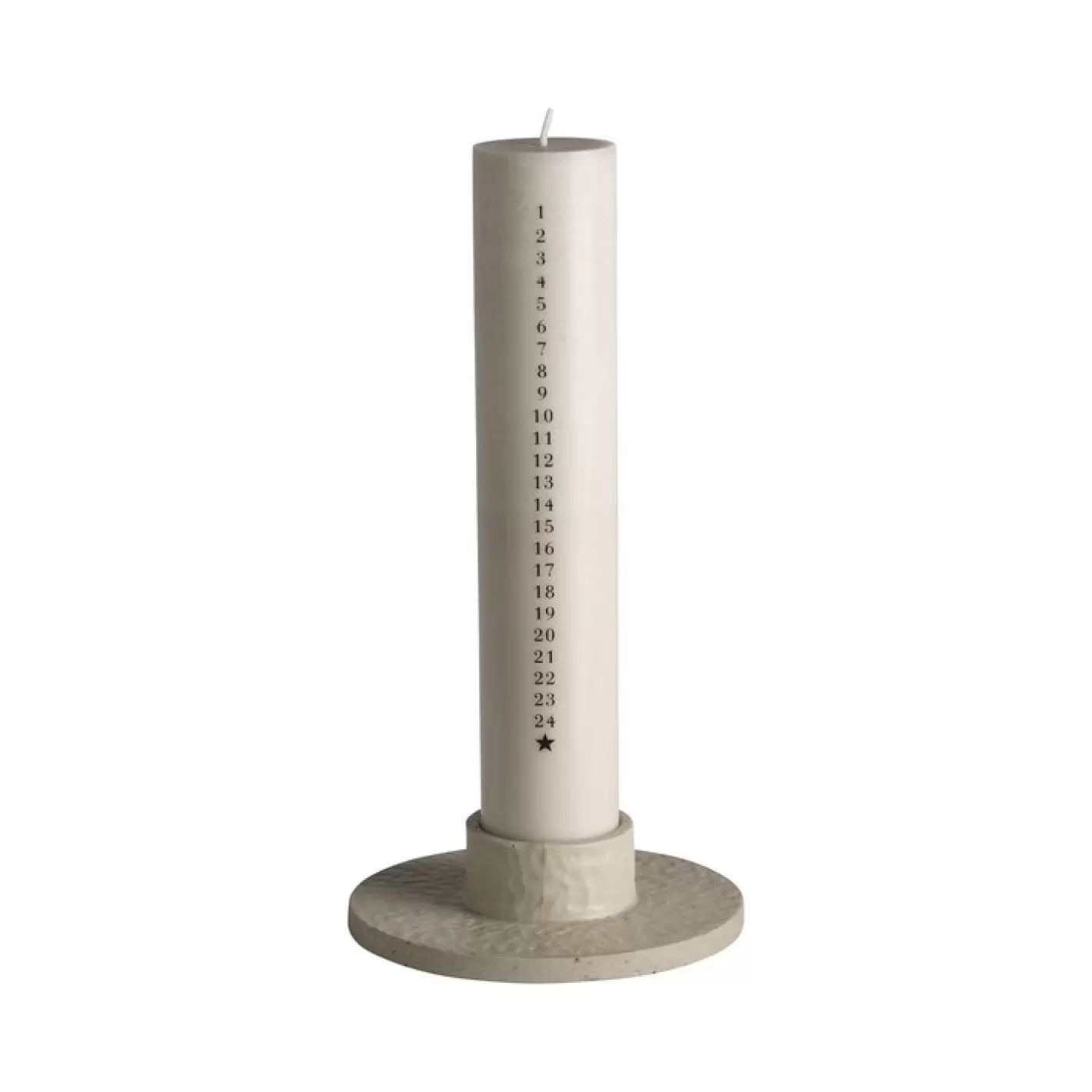 Lysestage af ler med mat sandfarvet glasur og en diskret dekorativ struktur i overfladen. Den enkle stage er perfekt til et kalenderlys i julemåneden, men kan bruges året rundt til bloklys med en diameter på 5 cm.