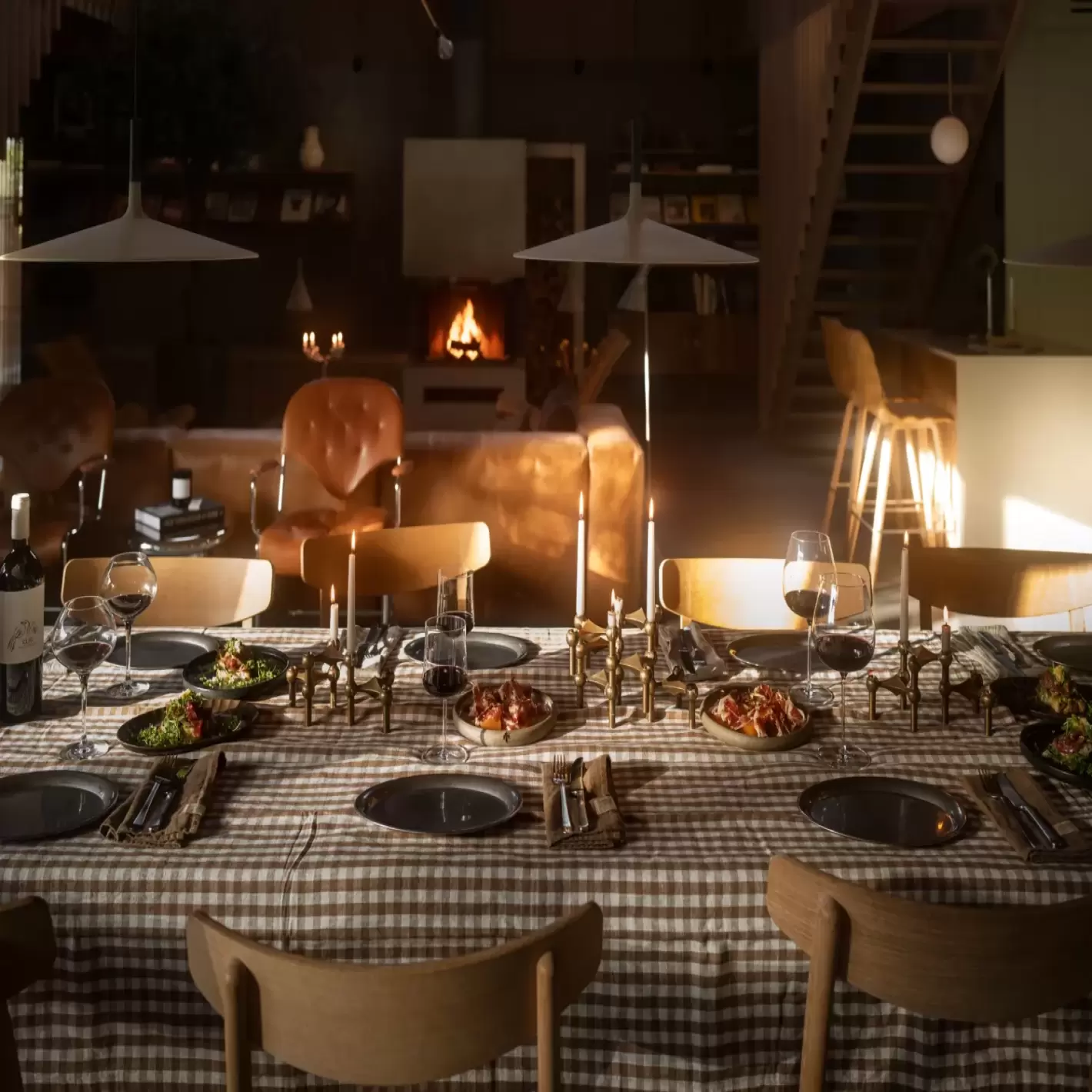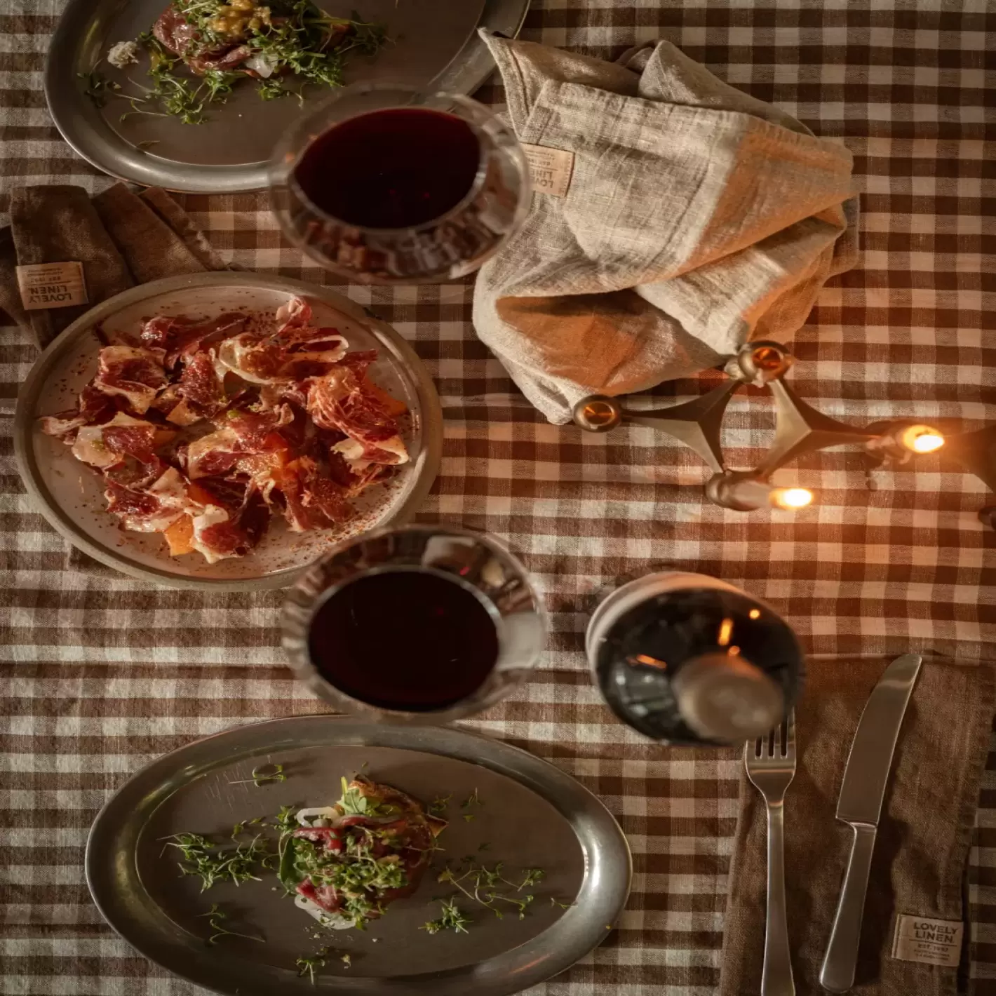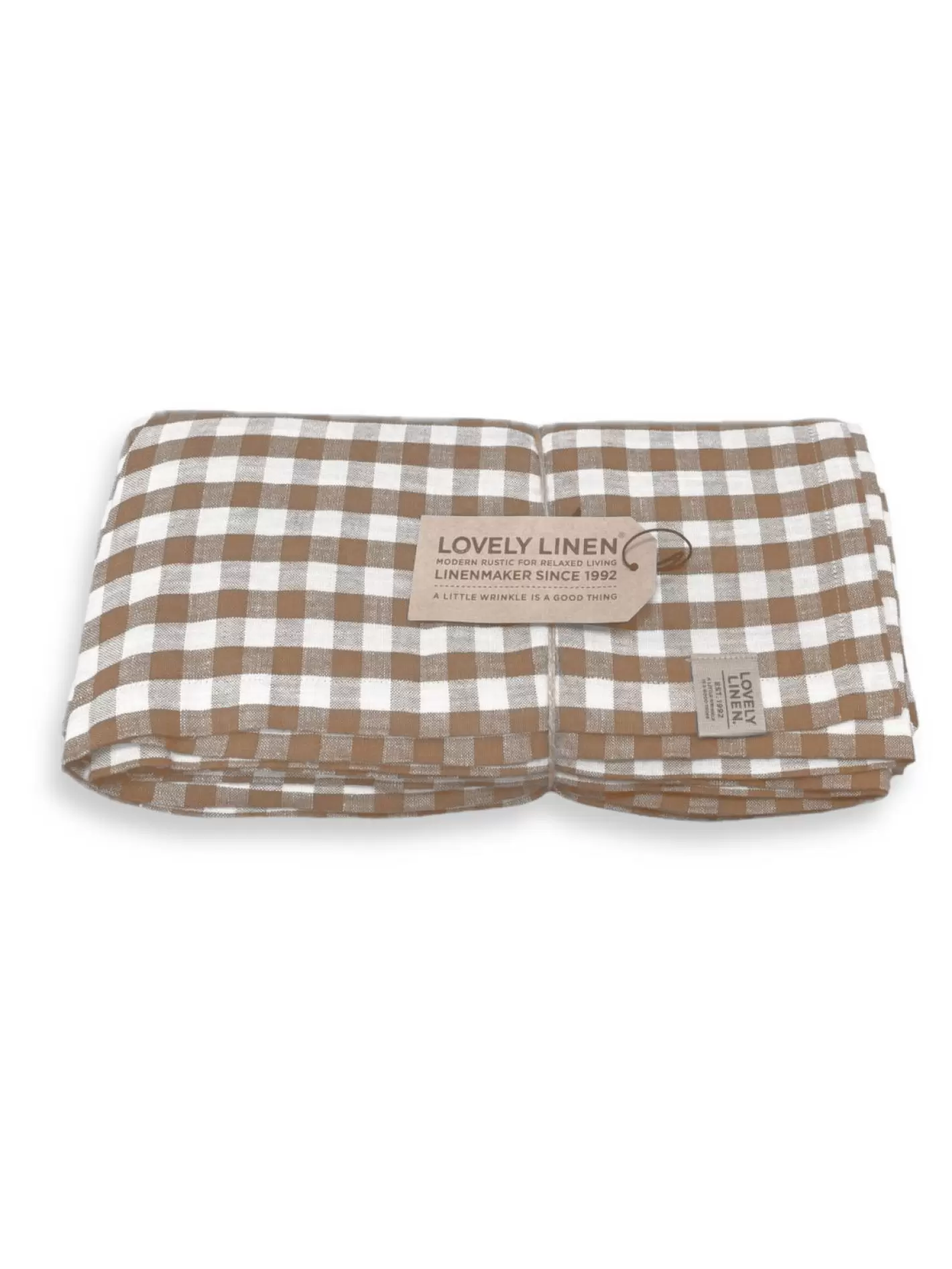 Kollektionen Misty er fremstillet af europæisk hør i en let og luftig specialvasket kvalitet, som har en skøn blødhed - og se lige hvor smuk dugen er med de smukke tern i mandelbrune og råhvide nuancer.