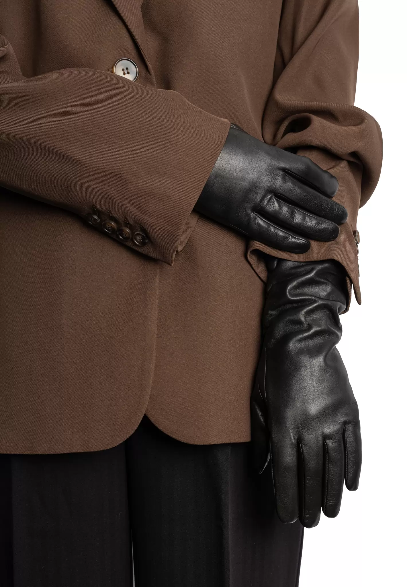 Lækker sort skindhandske med halvlangt skaft og feminine rynkedetaljer langs det ekstra skaftstykke.