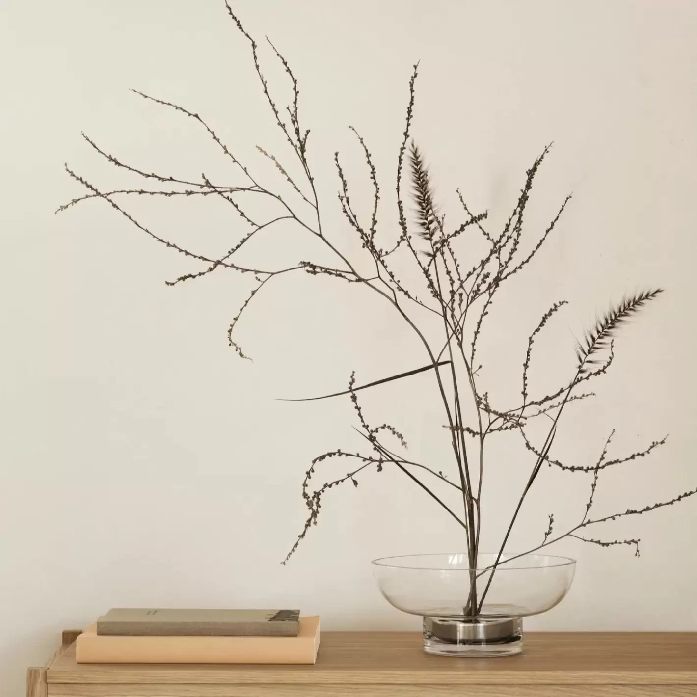 Ikebana-kunsten - den blide og mindfulde arrangement af blomster i skulpturelle vaser - er en integreret del af japansk kultur og derfor den oplagte inspirationskilde til denne vase. En kombination af mundblæst glas og det buede design af designer Kazushige Miyake - MIYABI-glasvasen. Begge genstande er kendetegnet ved tykke glasvægge af høj kvalitet, hvilket sikrer stabilitet. Grene og blomster kan arrangeres på en minimalistisk måde. Gitteret i rustfrit stål kan suppleres med blomsterskum eller blomsteraks, så grenene kan placeres i vasen.