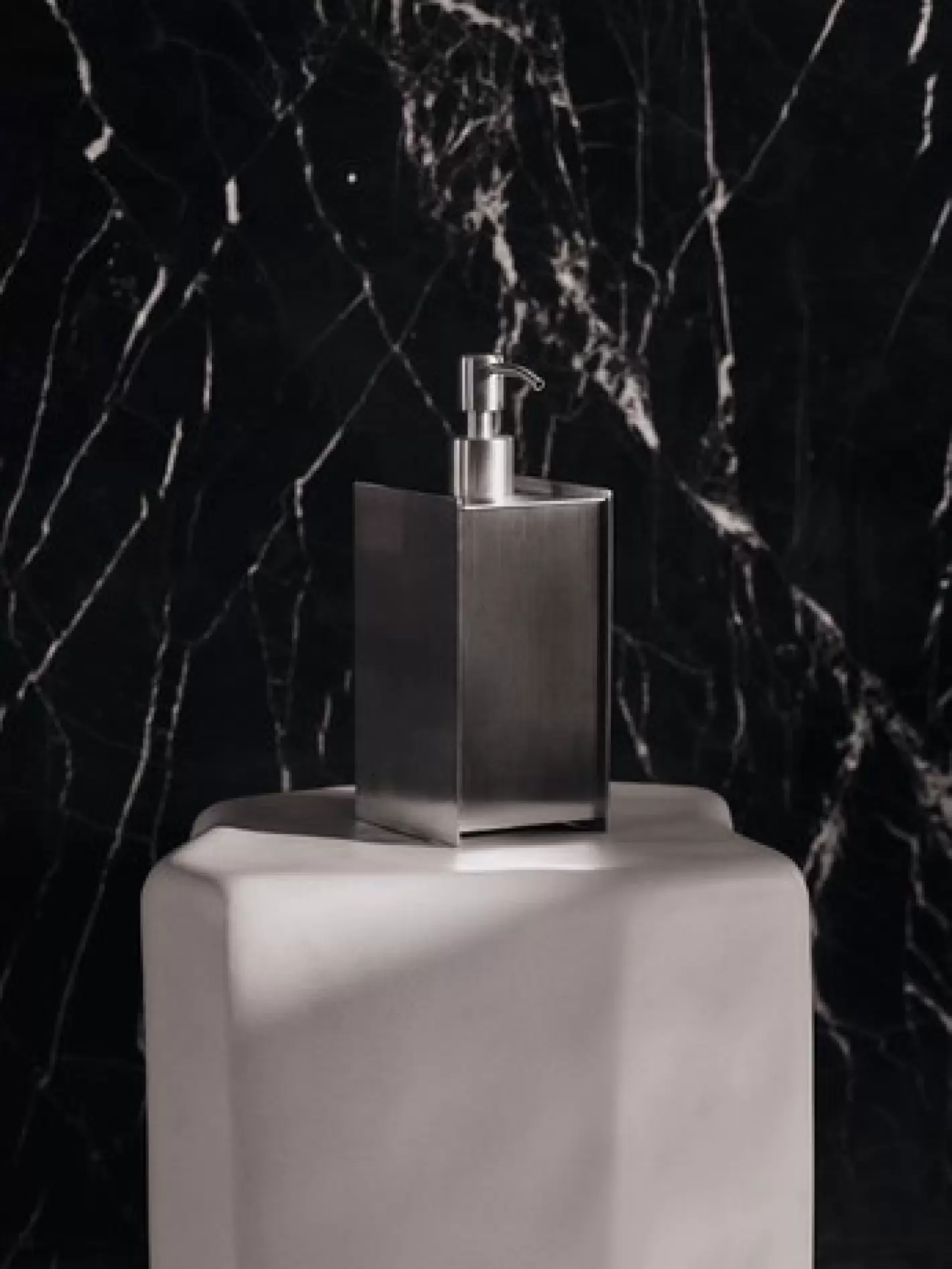 Sæbedispenseren til flydende sæbe er en del af serien Sama - en kollektion med badeværelsesudstyr fremstillet af børstet rustfrit stål.
