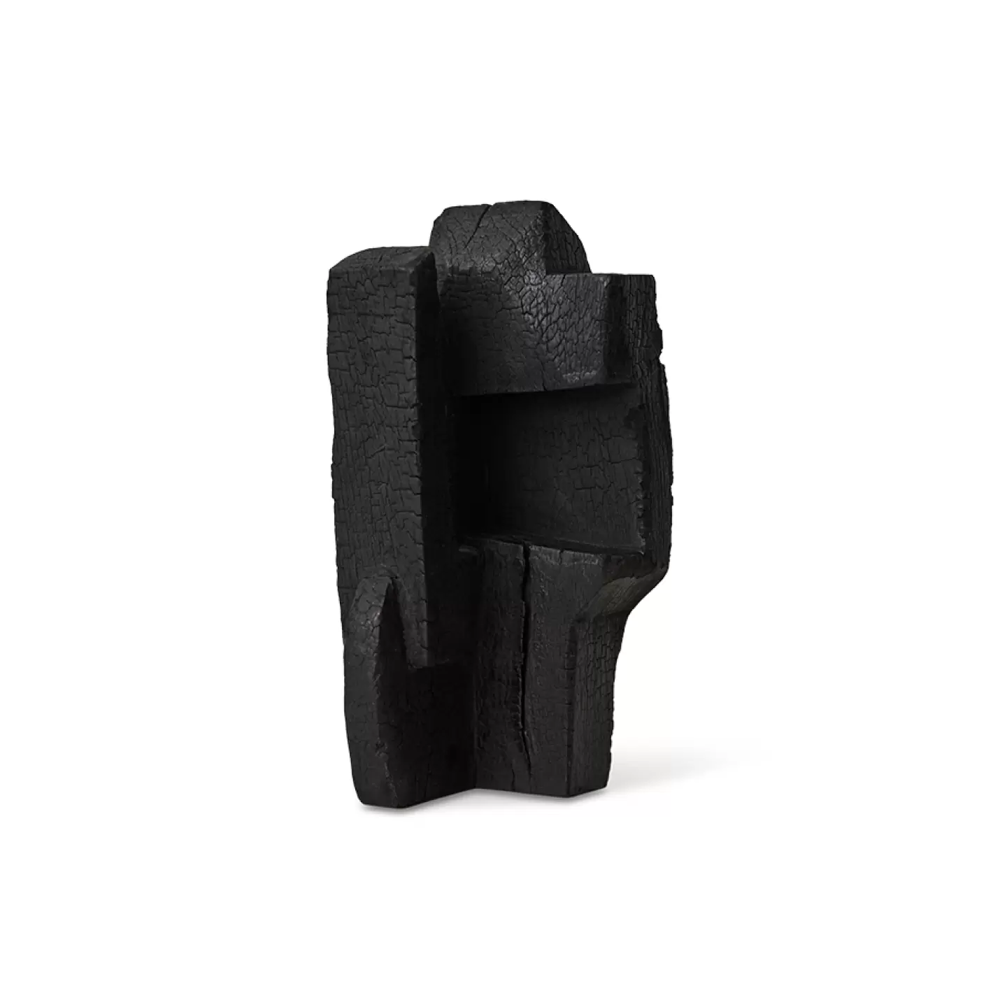 Lille i størrelse, stor i karakter. Denne træskulptur har en dyb sort, fuldt brændt finish, der giver den en taktil kant.