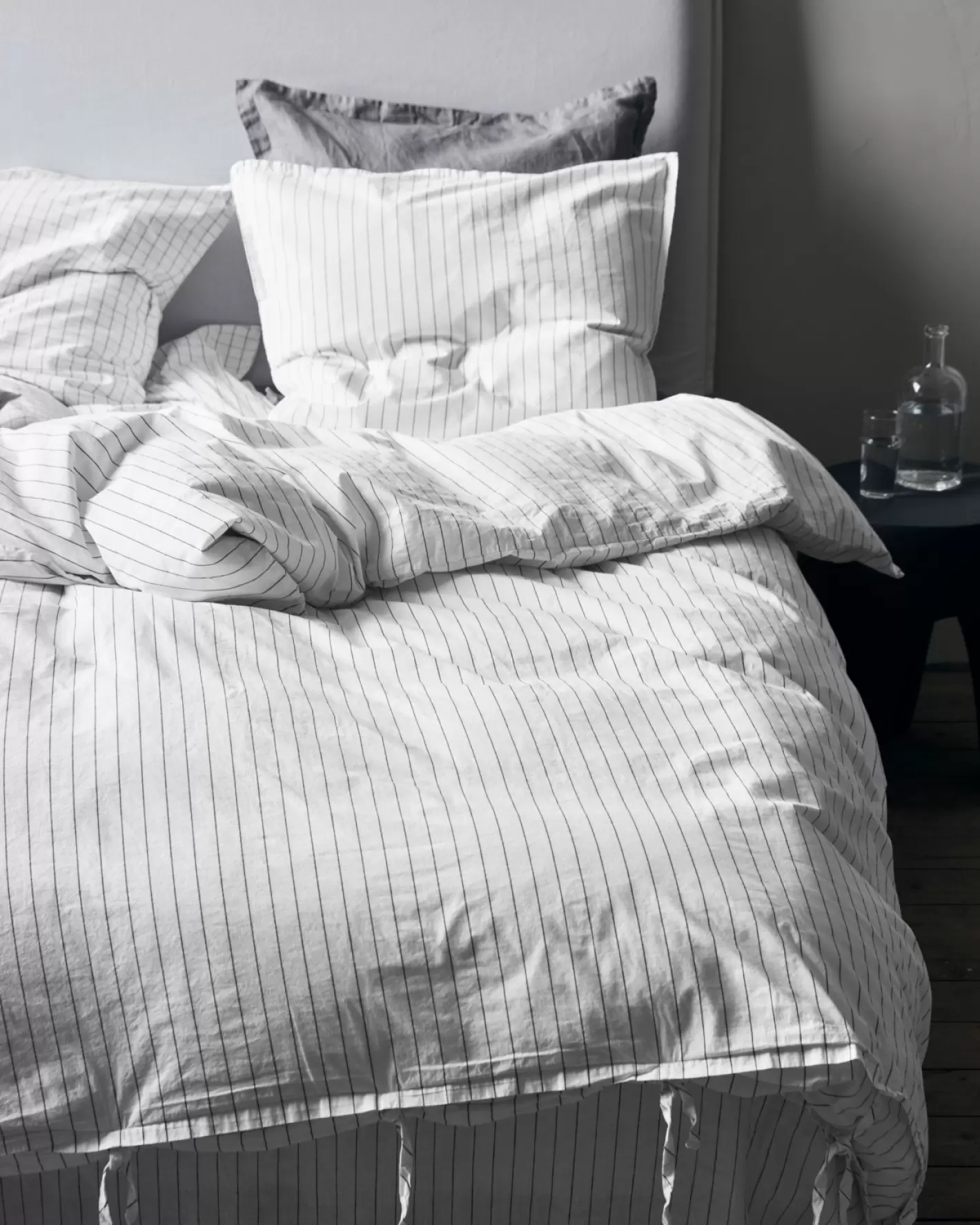 En enzymvask gør det hvide stof med mørke nålestriber endnu blødere og skaber et indtryk af diskret luksus. Med dette sengesæt fra byNORD får dit soveværelse en afslappet og intim atmosfære med fokus på lyse farver og luksuriøs komfort.