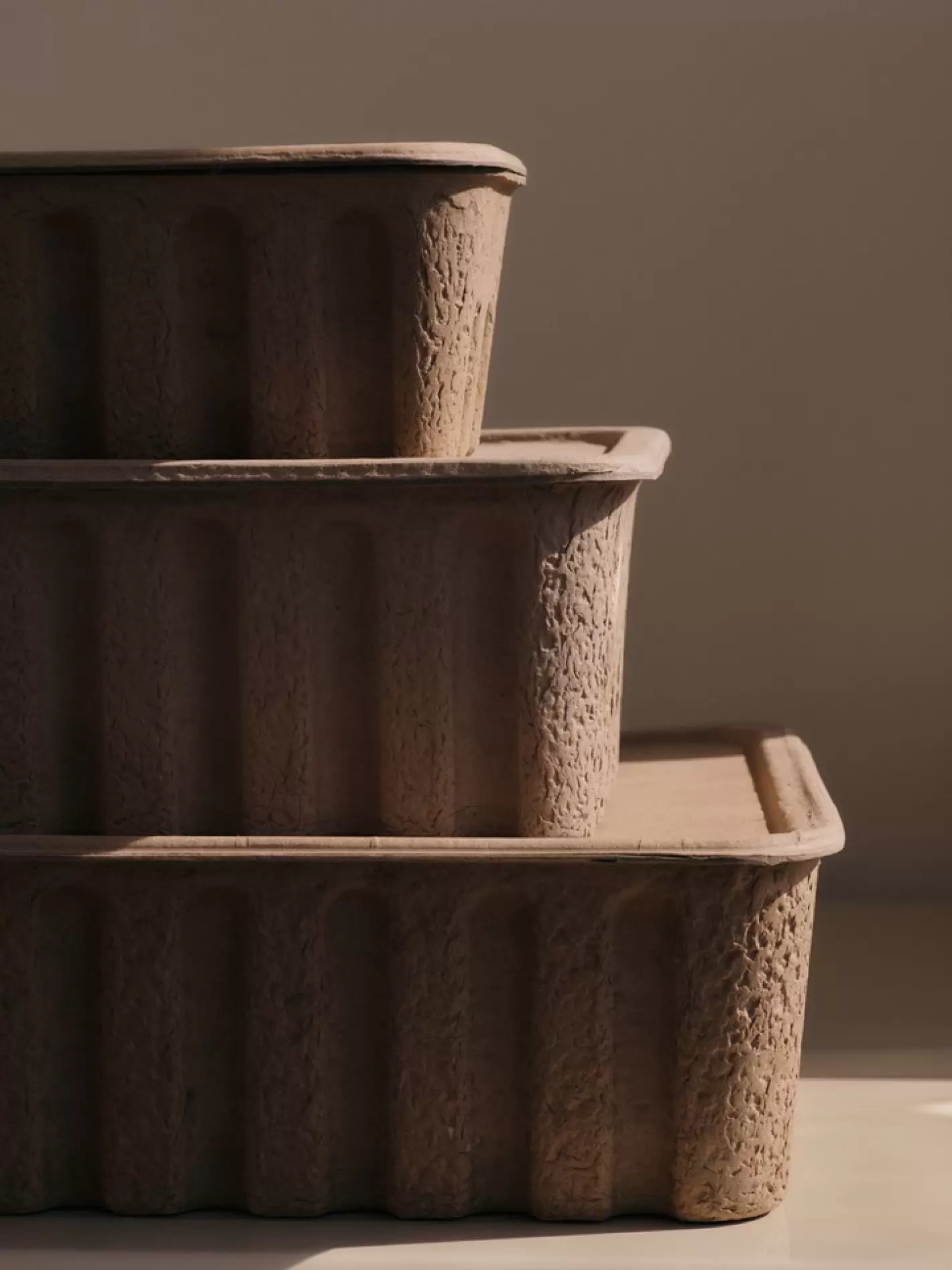 Ekstra stor stabelbar kasse med låg fremstillet af FSC®-certificeret 100% genanvendt og biologisk nedbrydelig papirmasse.