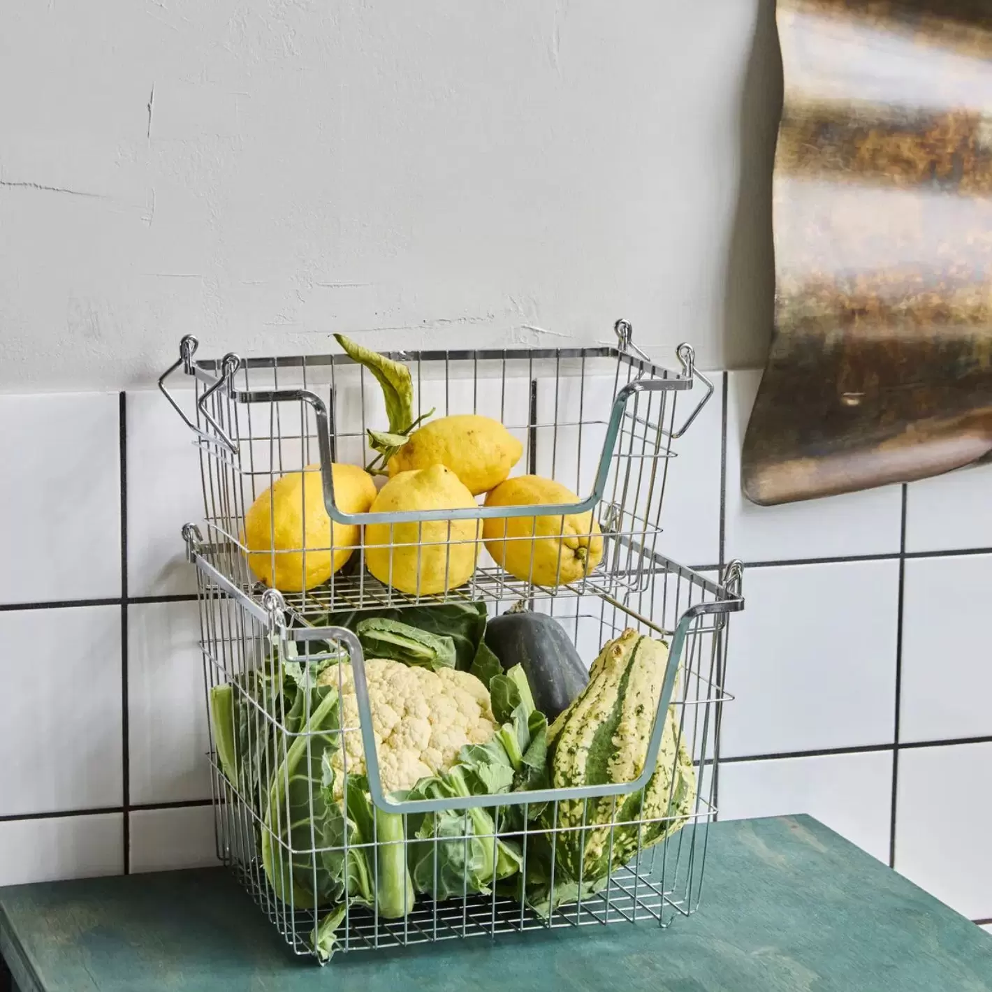 House Doctors serie af praktiske trådkurve af forkromet stål har en praktisk åbning foran, som giver nem adgang til indholdet. Kurvene fås i flere størrelser, og de kan alle stables, blot ved at vende hankene i siderne indad.