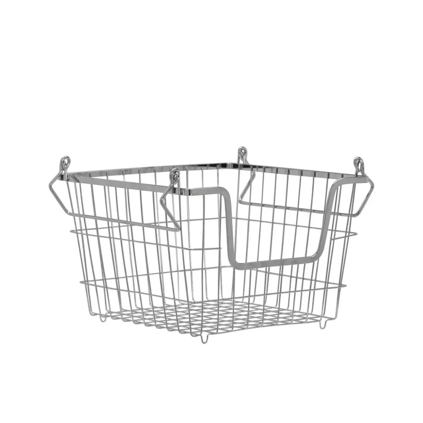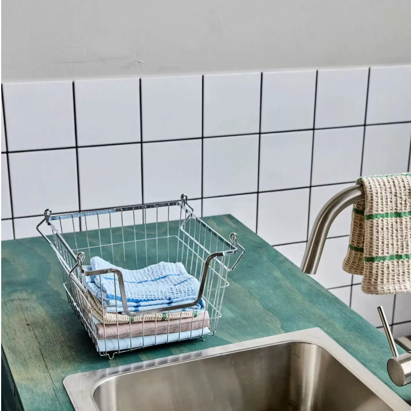 House Doctors serie af praktiske trådkurve af forkromet stål har en praktisk åbning foran, som giver nem adgang til indholdet. Kurvene fås i flere størrelser, og de kan alle stables, blot ved at vende hankene i siderne indad.