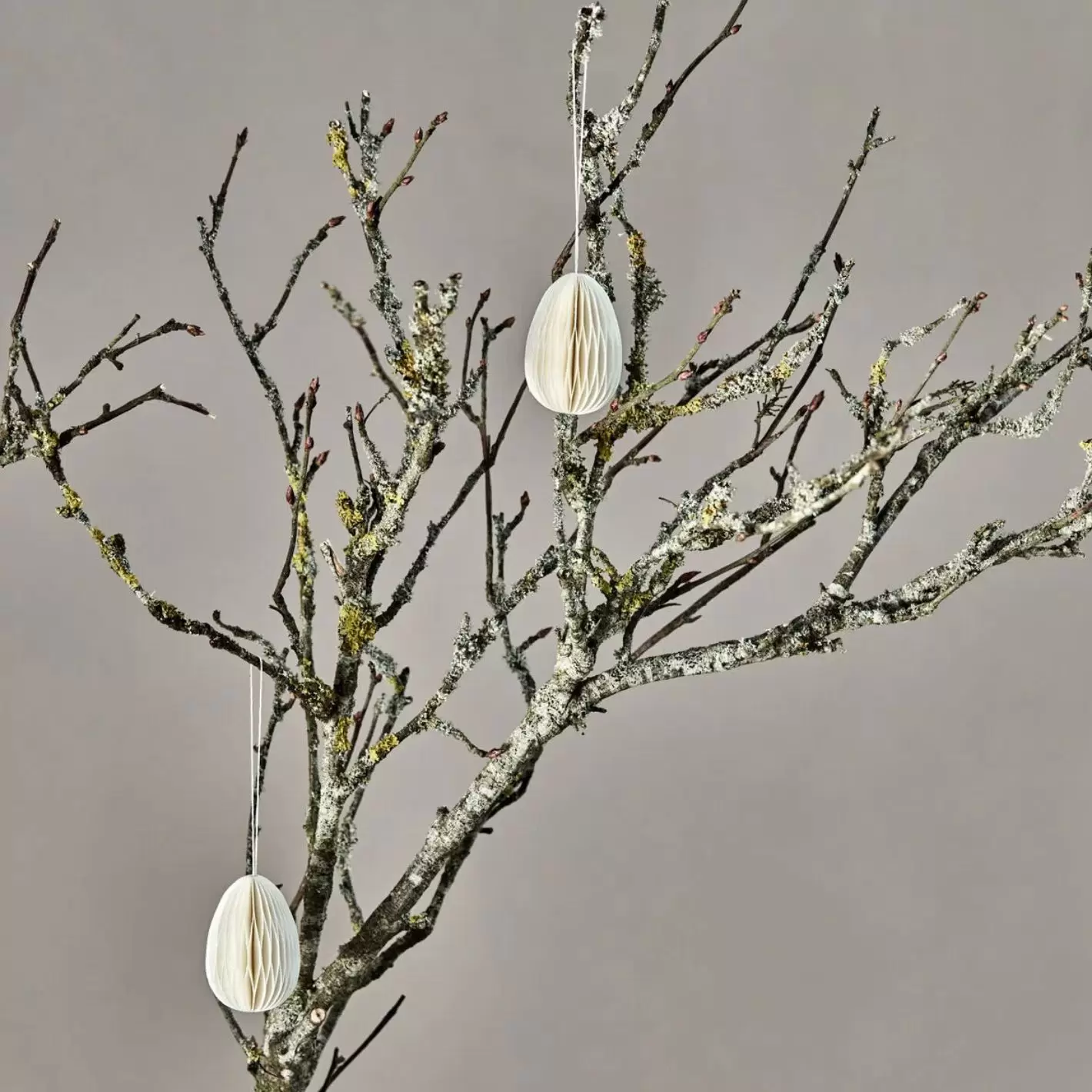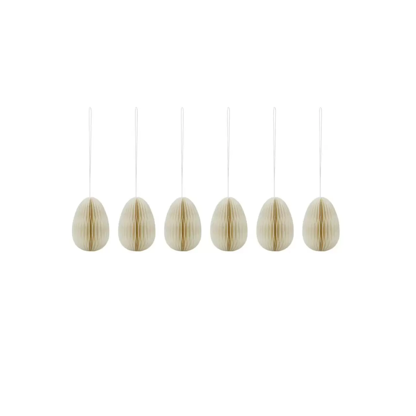 Sæt med 6 håndlavede påskeæg af råhvidt papir. Æggene har den fine tredimensionelle honeycomb-struktur, og har snor til ophæng, så du straks kan hænge dem på en forårsgren.