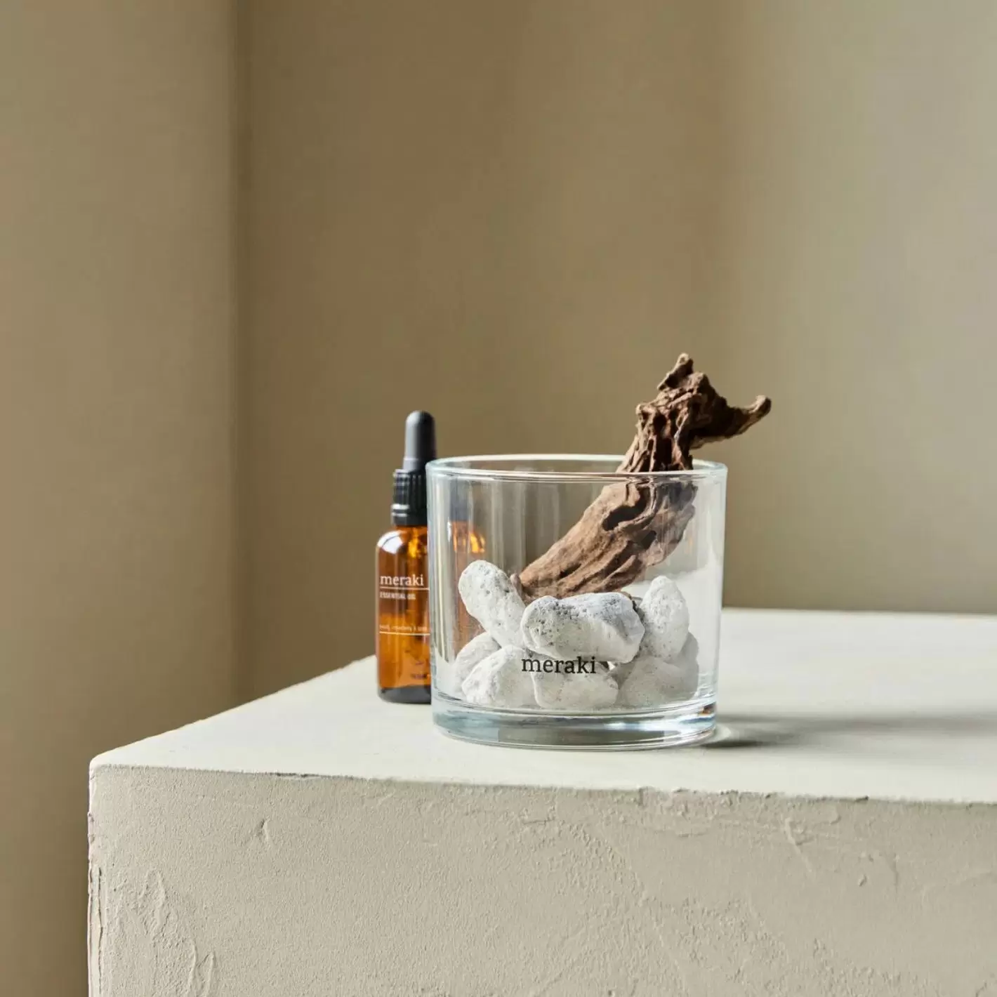 Skab ro og velvære i hjemmet med Merakis diskrete duftolie som kommer i en æske med et glas, en håndfuld lavasten og et stykke træ.