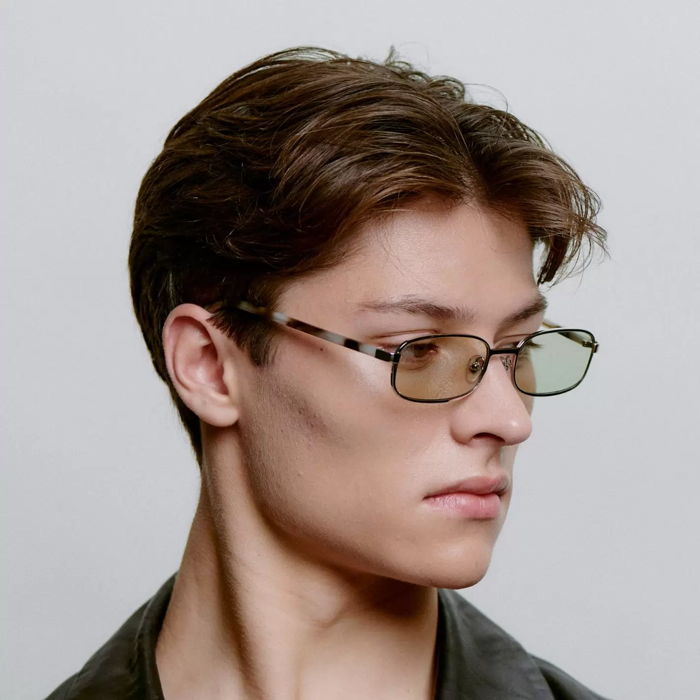 Klassisk unisex solbrille inspireret af 90'erne med et meget slankt stel og små kantede linser i en smal metalramme, som gør solbrillen til et fremragende valg til både små og store ansigter.