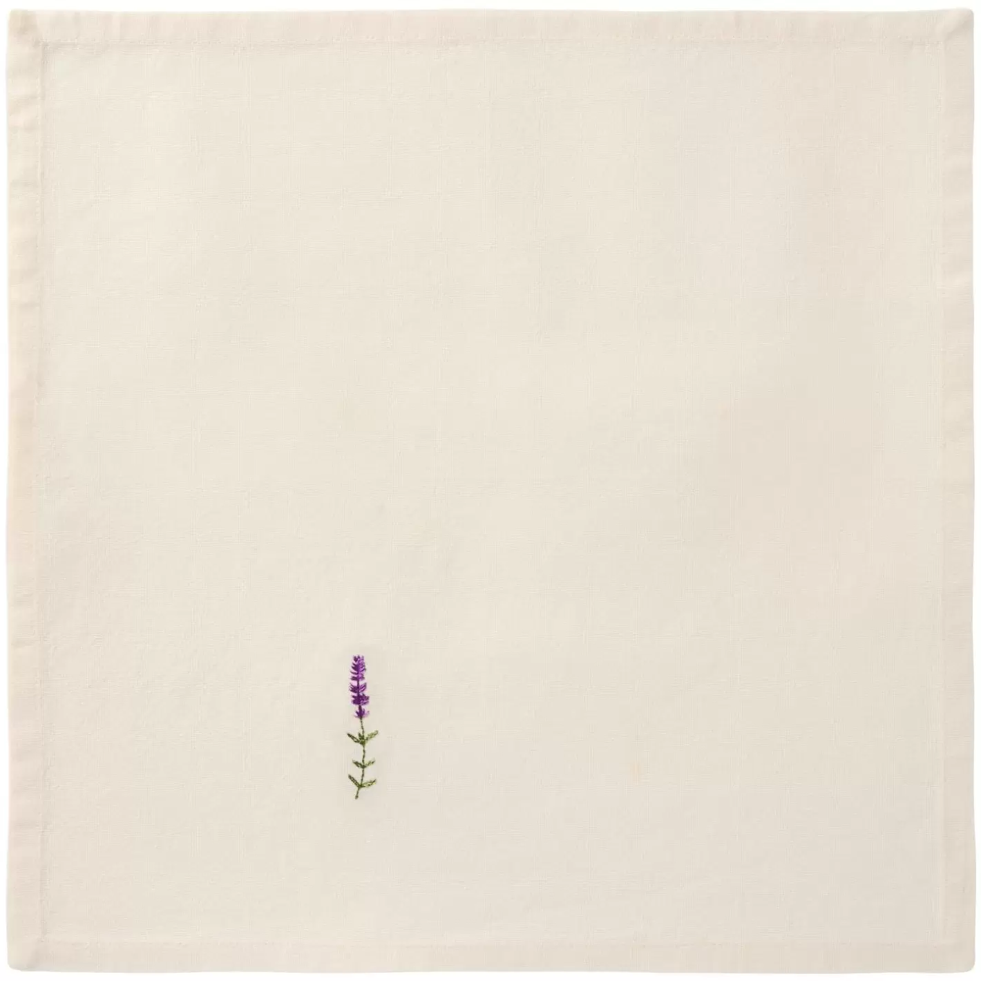 Dæk op med de fineste stofservietter som har motiv af en smuk lavendel broderet på en helt lys cremefarvet baggrund.