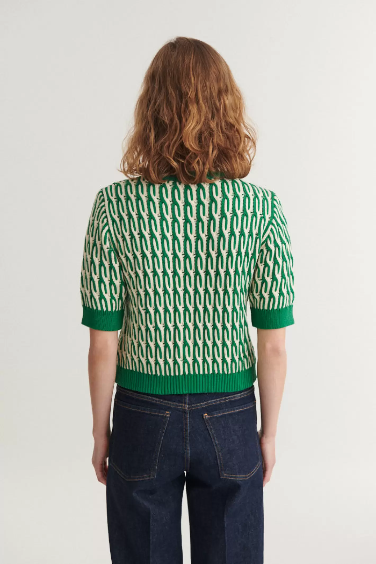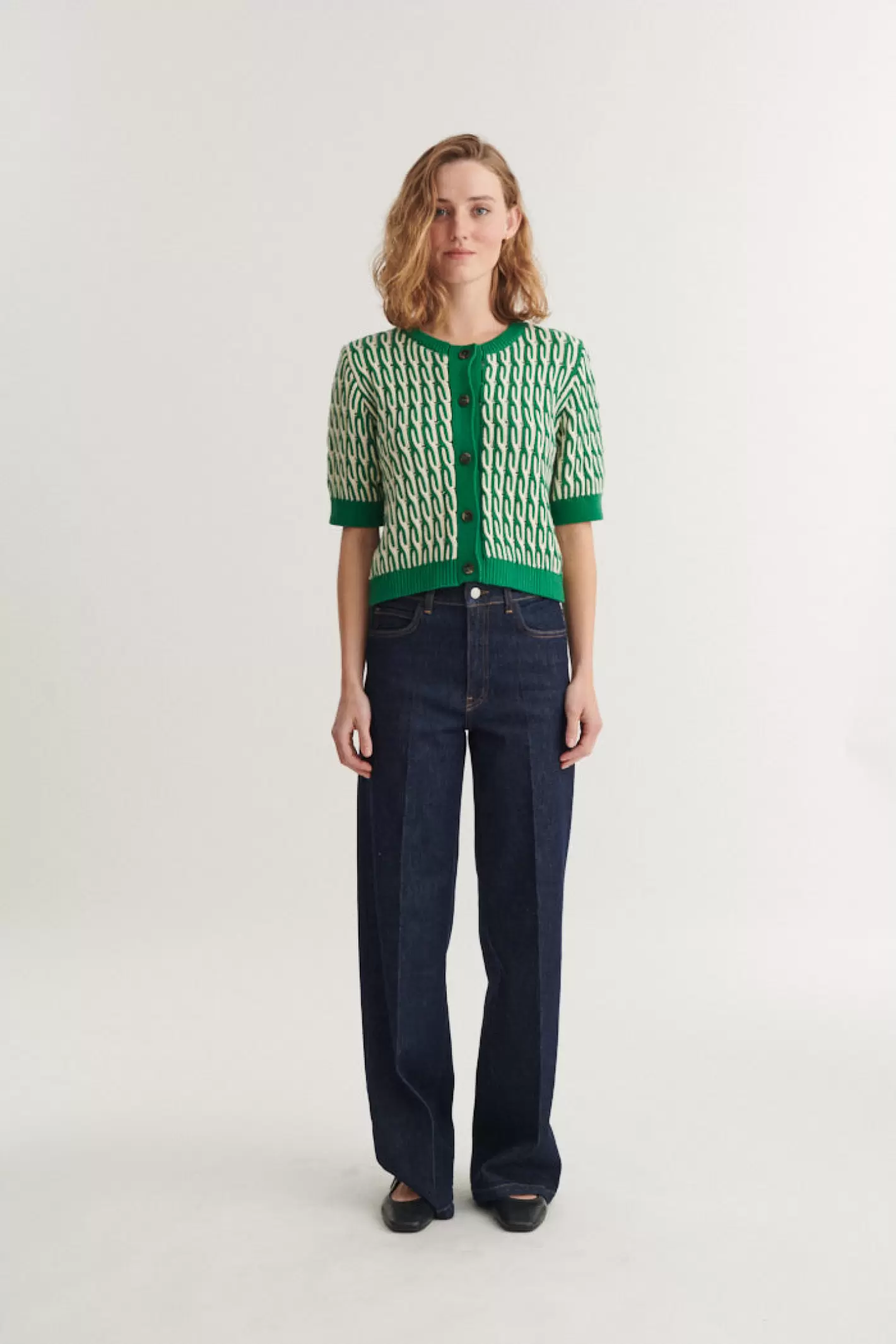 En let kabelstrikket cardigan af 100% økologisk bomuld med rund halsudskæring, korte ærmer og et afslappet fit. Den korte ærmelængde gør Minie idéel som et let lag, når du har brug for lidt ekstra, uden at det bliver for varmt.