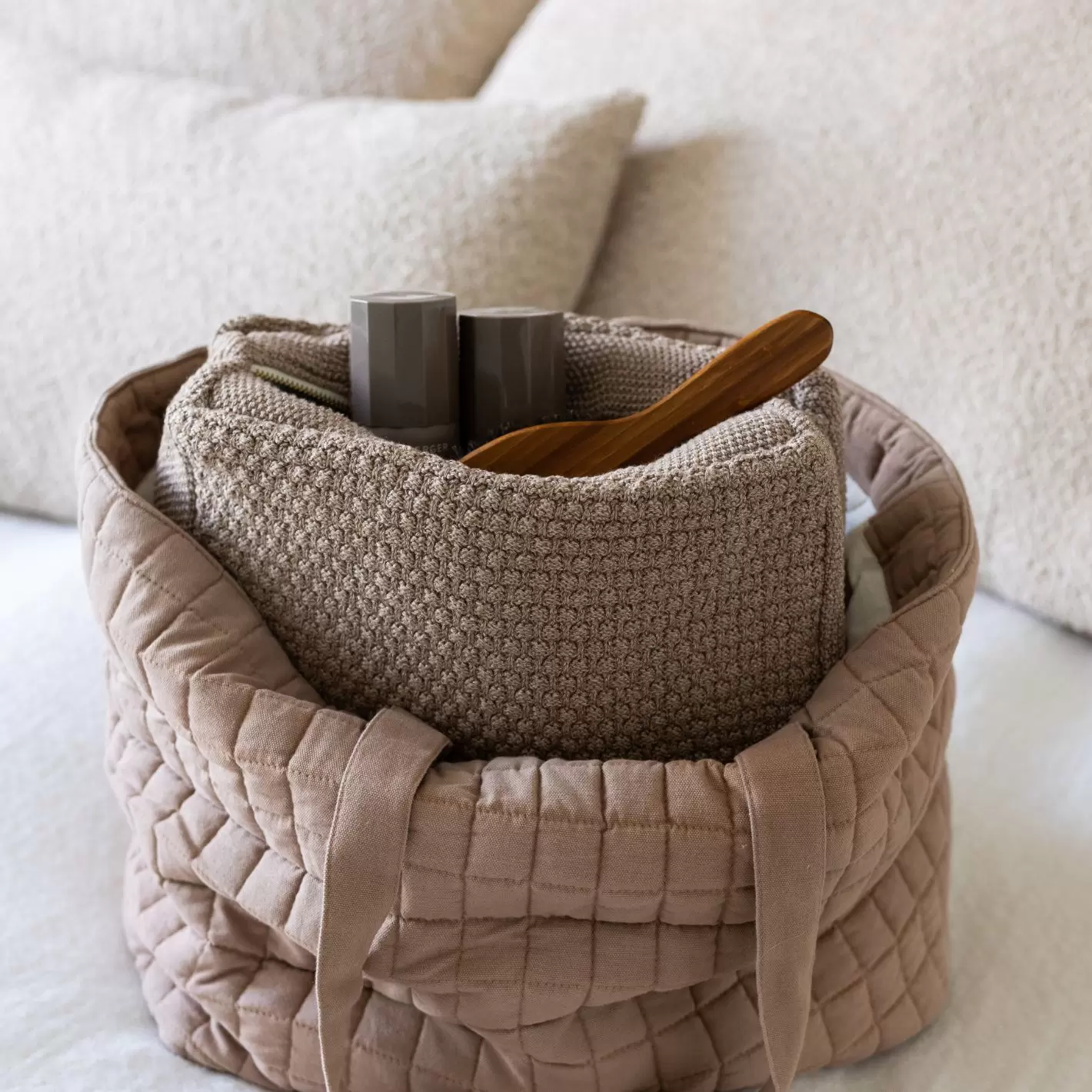 Stor og rummelig toilettaske strikket af 100% økologisk bomuld i en meget smuk meleret mørk beige/brun nuance. Toilettasken har ensfarvet bomuldsfor, et stort rum og en indvendig lomme.