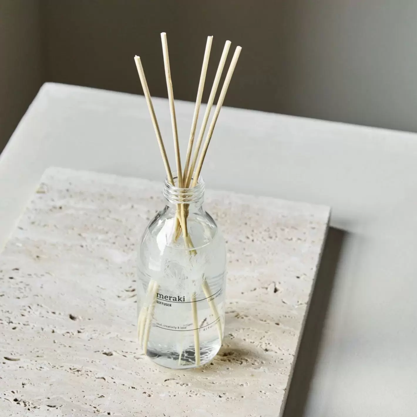 Diffuseren består af en klar flaske med træpinde, der spreder milde blomsternoter af jasmin, syren, ylang-ylang, viol, rose og lavendel på en base af moskus, cedertræ, vanilje og heliotrop.
