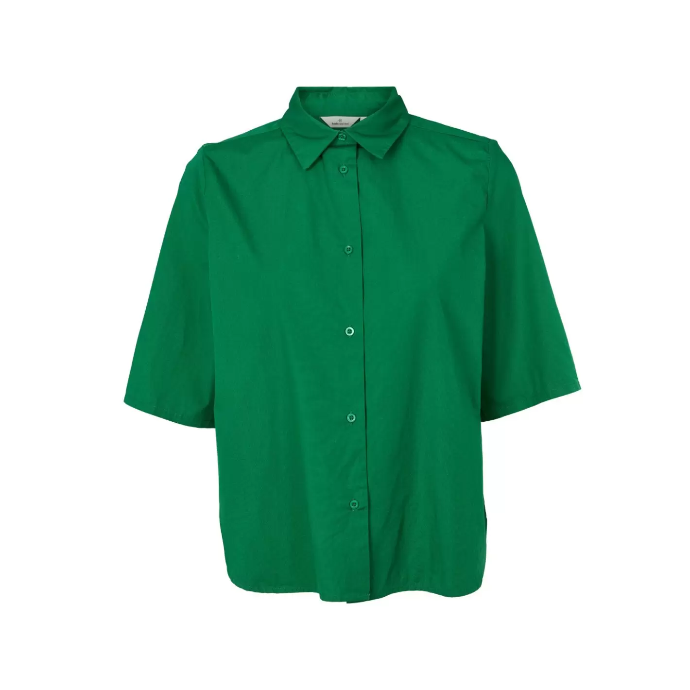 Løstsiddende gennemknappet skjorte med korte ærmer, klassisk skjortekrave og afrundede kanter for neden.
