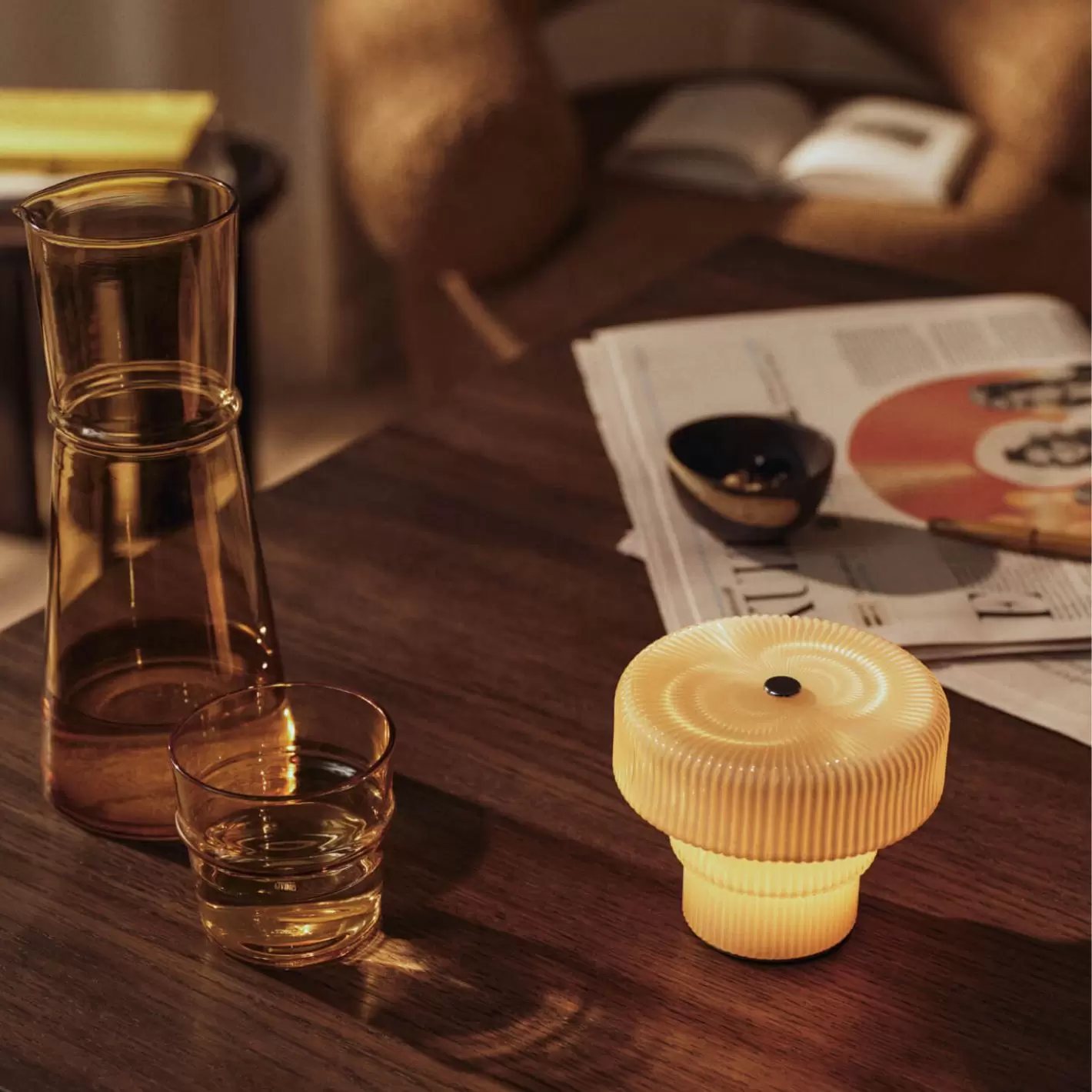 Ferms lille bærbare lampe af mundblæst rillet opalglas sender et blødt diffust lys ud i rummet, og med hele tre forskellige lysstyrker (10%, 50% og 100%) vælger du selv, hvor intenst lampen skal lyse - styrken ændres ved en let berøring af den forkromede knap på skærmens top.
