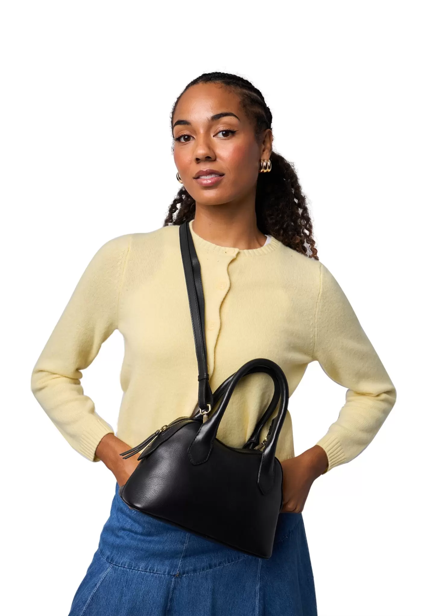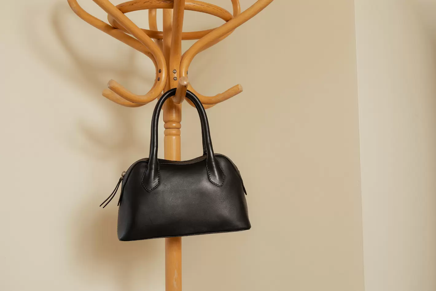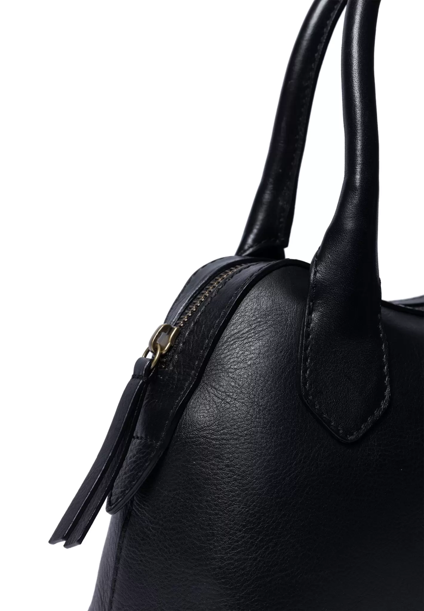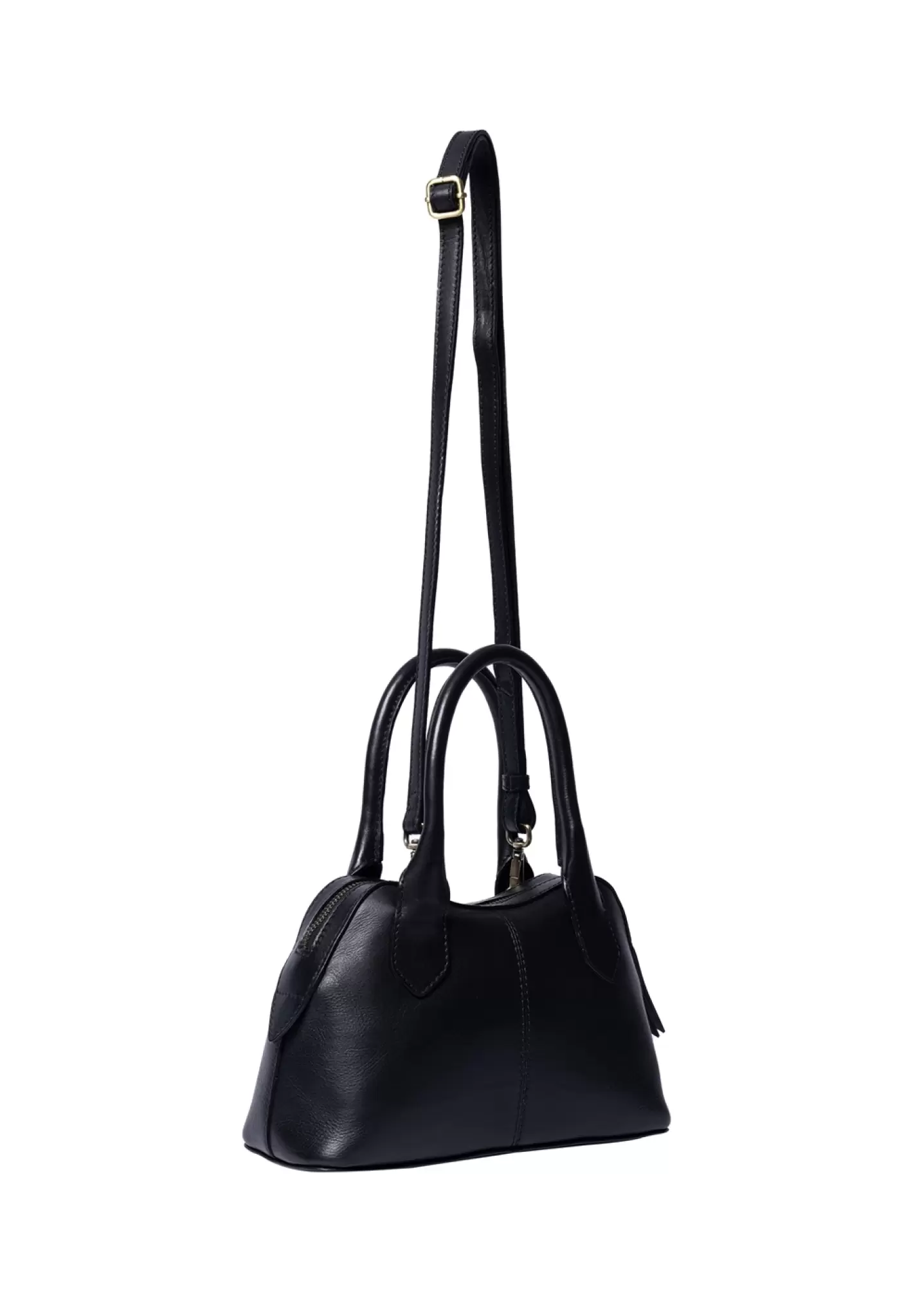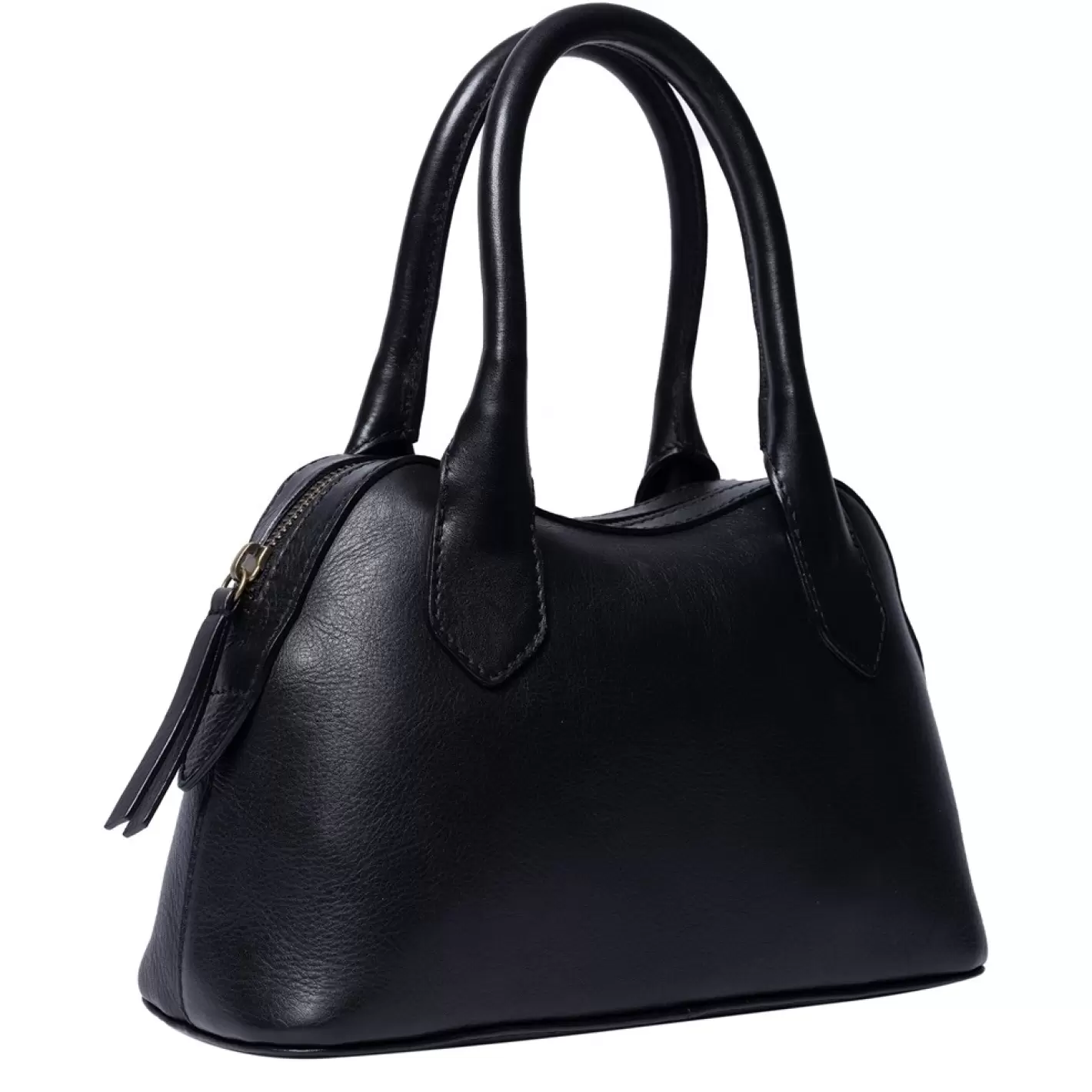 Lille rummelig håndlavet taske af lækkert skind med to hanke og en justerbar aftagelig rem, så tasken kan bæres i hånden, over skulderen og på tværs af kroppen.
